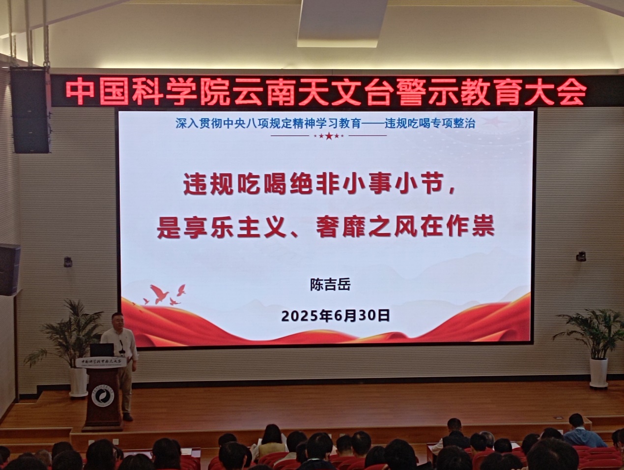 为深入学习领会习近平总书记关于加强党的作风建设的重要论述和重要指示批示精神,落实深入贯彻中央八项规定精神学习教育工作安排,6月30日,云南天文台召开警示教育大会,全体党员、在职职工和研究生参加会议。台长、党委书记陈雪飞主持大会。