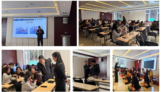 随后,由昆明理工大学附属安宁市第一人民医院副院长周国忠教授讲解日常急救知识,并带领大家开展实操训练。周国忠以“搭建急救基本思维”为核心,重点阐述了“六问三不”现场急救策略:围绕“环境是否安全”“气道是否通畅”“是否存在活动性出血”三大关键问题展开辨识与处理教学,同时指导如何快速判断病情、为伤者摆放合适体位,以及正确拨打120 相关技巧。最后,刘晓蓉护士长系统讲解了心肺复苏的要点并带领参会人员进行了实操练习。