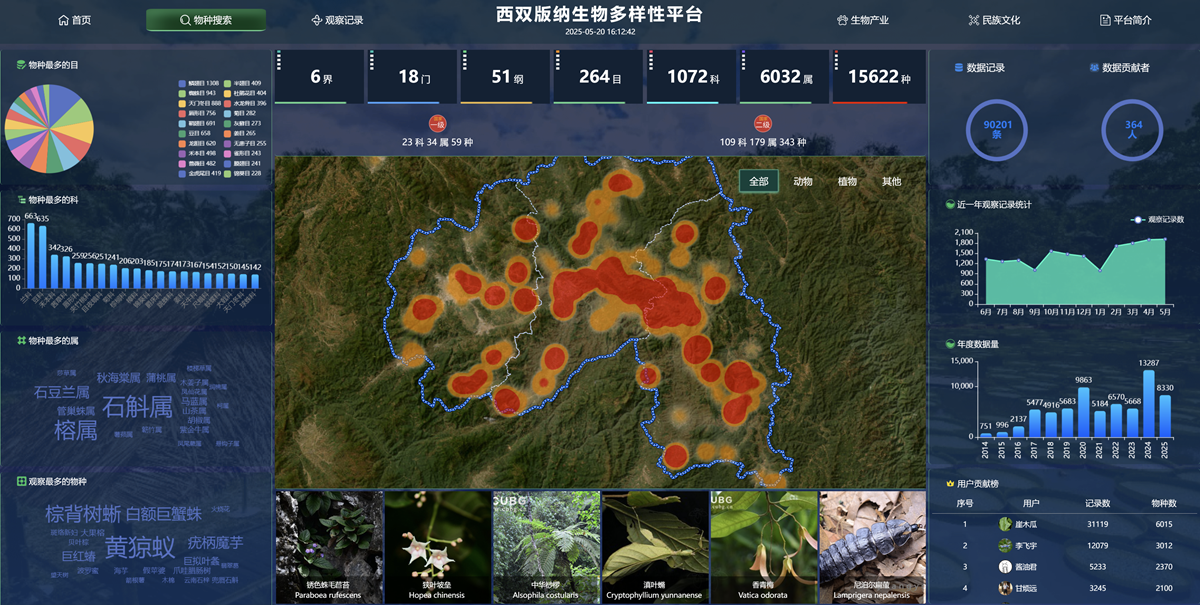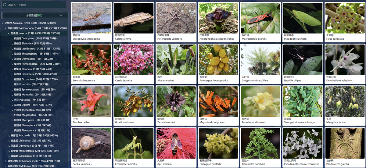 作为中国首个以热带生物多样性为主题的数字平台,向公众展示物种记录9万条,包含物种15622种(原生种约占70%),其中动物5236种、植物9779种、真菌等其他生物607种,国家一级保护物种59种、国家二级保护物种343种。所有数据来源于加新笔记公民科学平台(https://inewrecords.cubg.cn) ,这些数据包括新种和新记录文献、标本记录和自然观察记录,每条数据可溯源、可修订,动态展示最真实的西双版纳生物多样性。随着公民科学不断普及,会有越来越多人参与自然观察记录,西双版纳版纳的生物多样性家底也将越来越清晰。