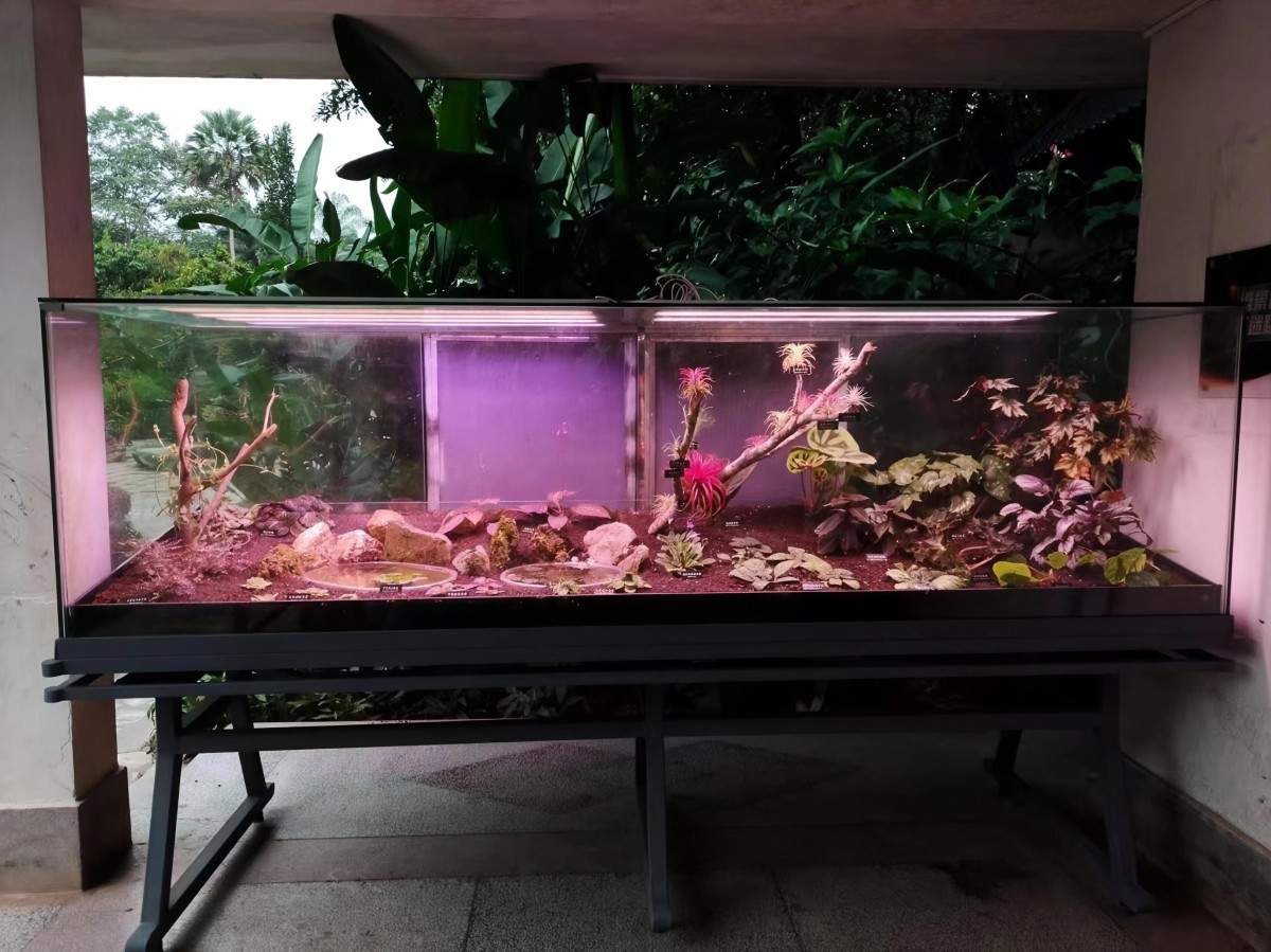 为提升奇花异卉园景观,增加奇特植物种类,近期奇花异卉园小水池旁的凉亭下新增了一个珍奇植物缸。此次制作的珍奇植物缸长3米,高1.8米,植物缸顶部配备照明补光设备。缸内栽培有世界上最小的睡莲——卢旺达睡莲、酷似菱角但不是菱角的菱叶丁香蓼、无需土壤就能生长的多种空气凤梨、花型奇特的原萝藦科植物细齿吊灯花、优质的植物形态学科普材料山黧豆叶珠子草、漂亮的蚁栖植物玳瑁球兰、叶形叶色丰富的各类秋海棠以及小巧可爱的各色报春苣苔属植物等近30种珍奇植物。