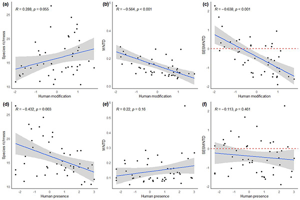 图1 人类改造和实时人类活动对兽类物种及功能多样性的影响