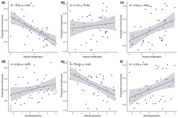 图2 人类改造和实时人类活动对兽类群落结构的影响
