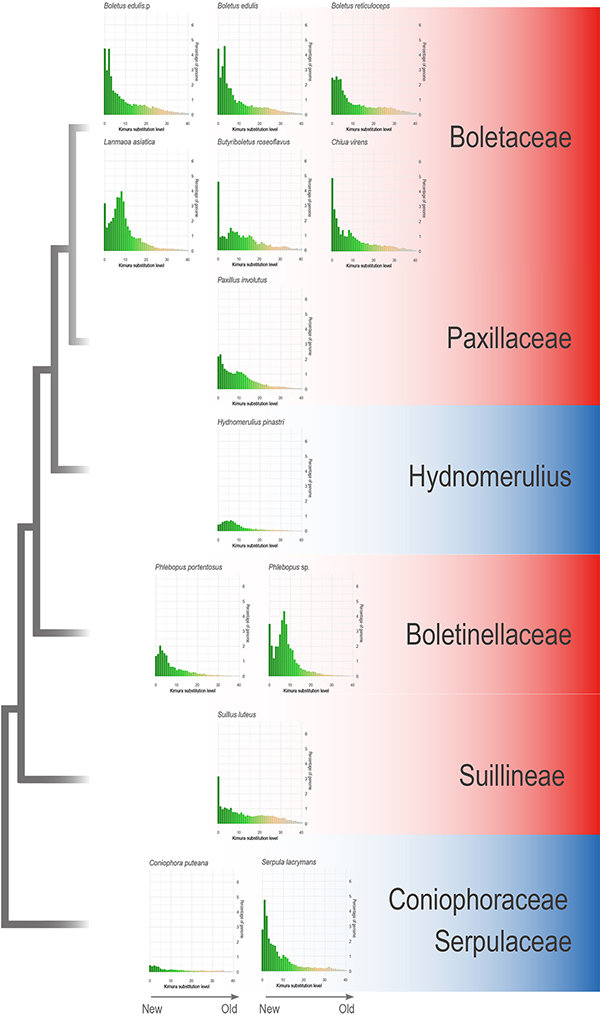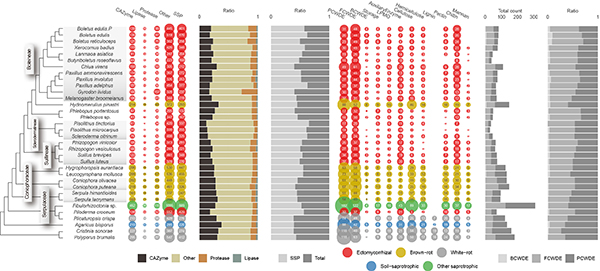 牛肝菌目是伞菌纲中物种最为丰富的类群之一,包括5个亚目,16个科,约1000个物种,广布全球,往往在森林演替后期出现。该目绝大多数为共生型的外生菌根真菌,宿主植物多样,但基部类群为腐生型的褐腐真菌,是研究真菌营养类型演变的理想对象。在对该目代表性物种基因组测序的基础上,通过比较基因组学分析,研究发现牛肝菌目物种从褐腐习性转向外生菌根共生习性的进化过程中,在基因组水平发生了三个创新:1)显著性地丢失了植物细胞壁降解酶系的关键基因,但仍保留了降解的一定能力,虽然营共生习性的支系情况各不相同;2)发生了转座元件的扩张,同时促进了编码蛋白酶、脂酶和小分泌蛋白等基因的形成;3)在晚中新世,共生型的牛肝菌科和乳牛肝菌亚目物种发生了明显的基因扩张,这可能与宿主植物或牛肝菌生境偏好有关。