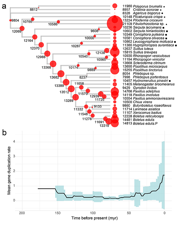图6 牛肝菌目物种基因复制历史重建(a)和演化过程中基因复制速率的变化(b)