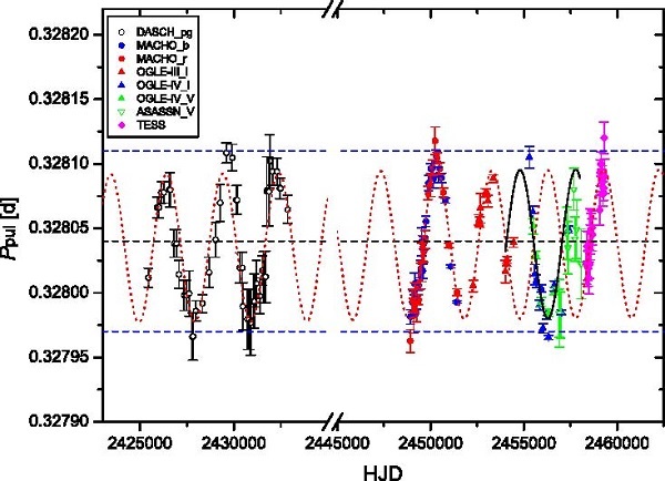 图2.剑鱼座BE脉动周期变化图。图中可见周期表现出准周期性的起伏变化(红虚线)和突变(黑实线)。