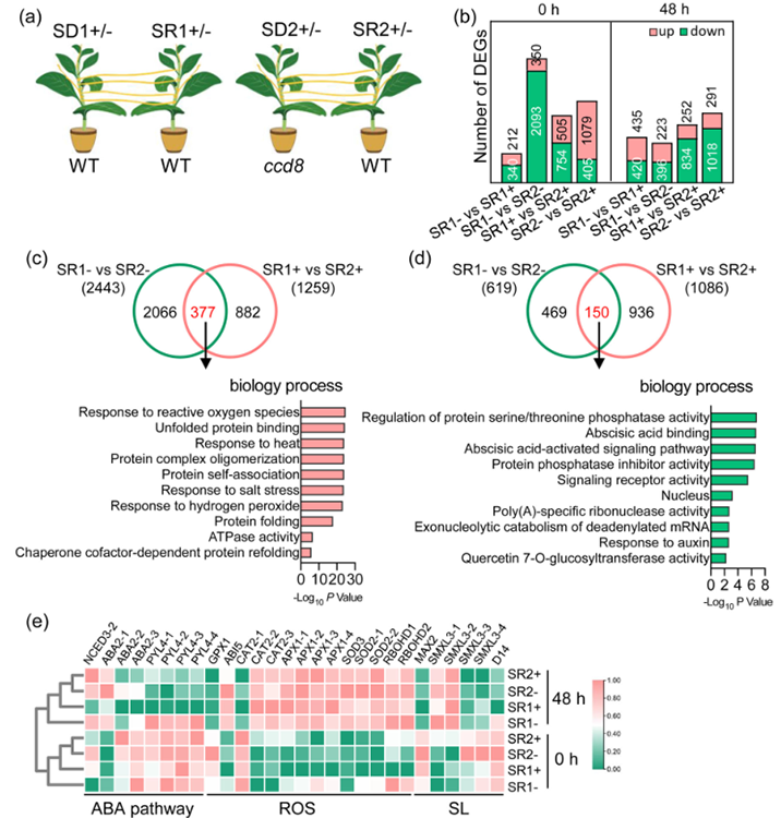 该团队继续围绕上述科学问题进行了深入研究。团队利用CRISPR/Cas9制备了多个信号通路突变体,采用多种生理生化手段结合转录组分析发现,在菟丝子连接的两棵烟草植物组成的植物群体中,当受胁迫的信号发射者植物中的独脚金内酯、活性氧或脱落酸途径缺失时,与之相连的信号接收者耐盐性会增强,表明这些途径在正常情况下抑制了菟丝子介导的系统性盐胁迫信号的传递。研究还发现独脚金、活性氧和脱落酸途径负调控系统性priming信号的作用。转录组数据也表明,信号发射者植物中由独脚金内酯调节的盐诱导系统性信号可能也会影响信号接收者植物中的活性氧和脱落酸信号通路,三者间通过复杂的互作网络调控菟丝子介导的系统性信号。该研究揭示了植物激素和活性氧在菟丝子介导的植物间通讯中的重要调控作用,对于理解菟丝子传递的盐胁迫相关系统性信号传递具有较好的理论意义。