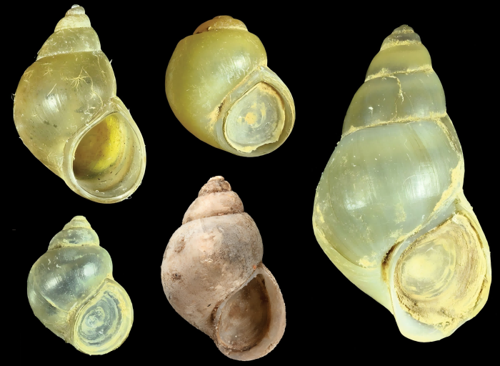 茵莱湖的部分豆螺科物种:肋唇似觿螺(左上),小加氏螺(左下),膨胀似觿螺(中上),无肋似觿螺(中下),伊洛瓦底双角螺(右)