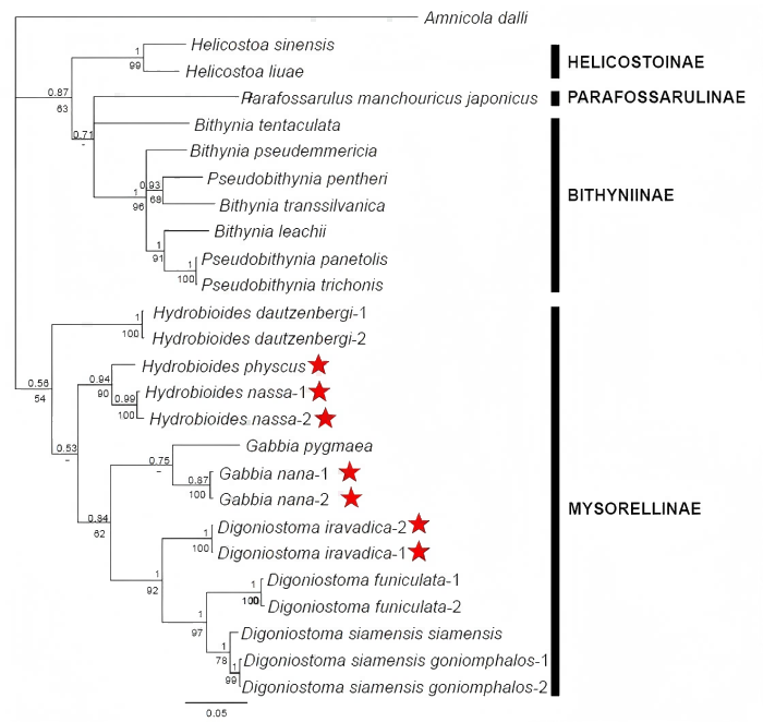基于COI 和16S部分序列的包含了4个茵莱湖豆螺科物种的分子系统树
