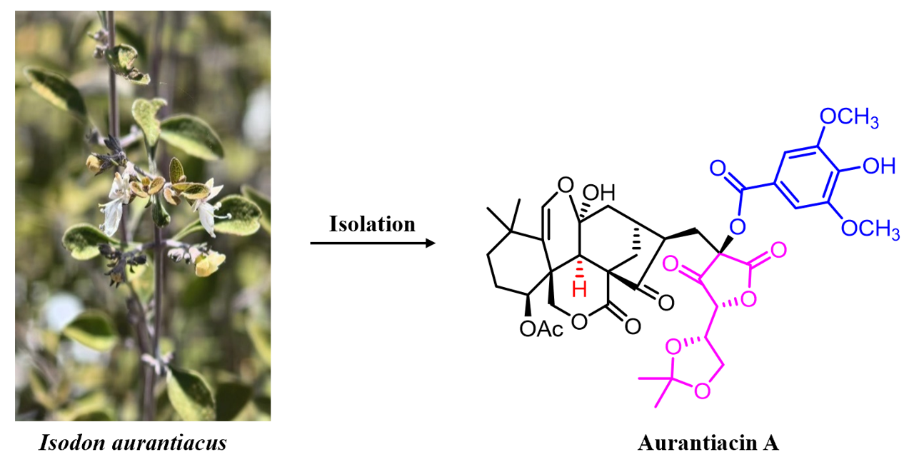 图1 橙黄香茶菜中发现的新颖杂二萜Aurantiacin A