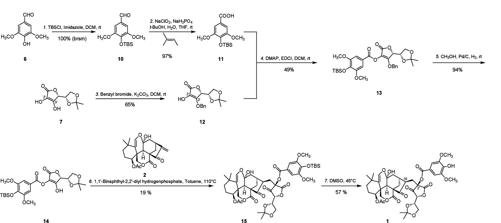 橙黄香茶菜(Isodon aurantiacus Y.P. Chen & C.L. Xiang)系唇形科(Lamiaceae)香茶菜属植物,该物种由中国科学院昆明植物研究所向春雷研究团队于2017年首次描述并发表为新种,种加词“aurantiacus”源于其叶片表面遍布的橙黄色腺体,这一特征也是其重要分类学依据。鉴于该植物次生代谢产物研究尚属空白,中国科学院昆明植物研究所普诺·白玛丹增专题组首次系统开展了其次生代谢产物的研究,成功分离获得了结构新颖的杂二萜类化合物Aurantiacin A(图1)。该分子的化学结构由三部分组成:H-9取向翻转的首个对映-贝壳杉烷型二萜、L-抗坏血酸衍生物和丁香酸,其多手性中心与连续季碳原子的结构特征使得立体构型确证极具挑战。