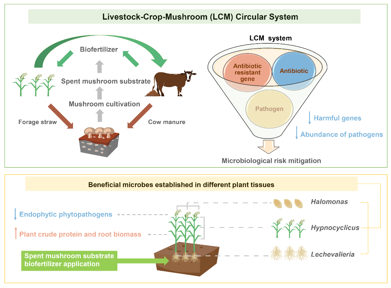 图1 畜禽-作物-食用菌(LCM)循环:植物生长提升与微生物风险阻控的环境友好系统