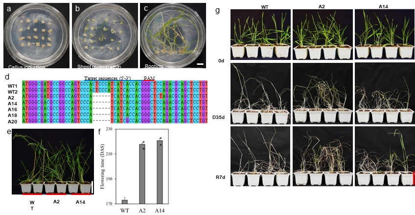 近日,中国科学院昆明植物研究所青藏高原植物进化与适应专题组联合青海大学青海省畜牧兽医科学院成功建立了基于农杆菌介导的垂穗披碱草遗传转化体系,并利用CRISPR/Cas9基因编辑技术获得了5个EnTCP4基因编辑株系。Entcp4突变体植株表现出显著的开花延迟表型,并且展现出较强的抗旱性。该研究不仅成功构建了垂穗披碱草的稳定遗传转化体系,而且通过基因编辑创制了兼具开花时间延迟与抗旱能力增强的优异种质资源,为后续开展垂穗披碱草的基因功能研究和分子定向育种提供了关键技术支持和材料保障。