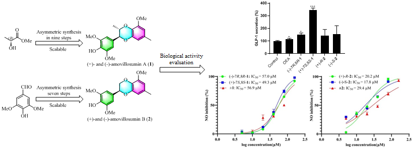 1,4-苯并二恶烷作为一种重要的药效团,在药物化学领域备受关注。基于1,4-苯并二恶烷类化合物在药物开发中的应用前景,耿长安团队与汪亮亮团队合作以廉价易得的起始原料,分别通过九步和七步反应,实现了amovillosumins A和B的高效不对称全合成,总产率45-47%,对映体纯度91-95% ee。通过全合成不但证实了amovillosumins A和B的绝对构型,也为后续药理活性和机制研究提供了充足的样品。进一步通过分子生物学和网络药理学等手段,揭示了amovillosumins A和B不同异构体的降糖和抗炎活性及分子机制。