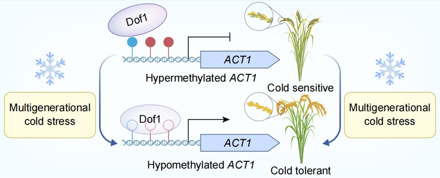 分子机制研究表明,低温胁迫通过抑制DNA甲基转移酶MET1b的表达,导致ACT1启动子区甲基化维持受阻,形成低甲基化表观等位型。进一步研究发现,ACT1启动子的甲基化变异区域存在转录因子Dof1的结合位点,其结合对DNA甲基化敏感。Dof1为一个受冷诱导表达的激活型转录因子,敲除后显著降低孕穗期的耐冷能力。这些研究揭示了完整的冷适应调控通路:低温胁迫下调甲基转移酶MET1b的表达,引发ACT1启动子DNA甲基化丢失,促进Dof1的结合,从而激活ACT1表达,赋予水稻耐冷性。