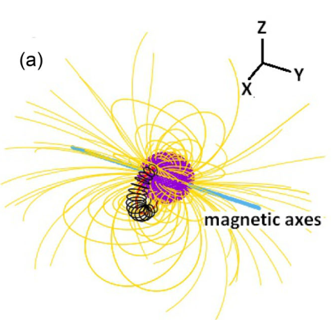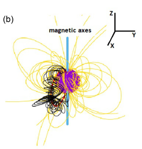 图1:磁通量绳存在时,星表面附近的磁场分布。紫色圆球表示星,蓝色线表示磁轴,红色线表示磁通量绳,黄色线为磁力线,黑色线为绳附近的磁力线。左图和右图分别显示了磁通量绳垂直和平行于磁轴的两种情况。