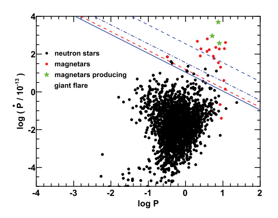 图2:中子星的周期与周期变化率的分布,黑色点是普通中子星,红色点是磁星,绿色五角星是观测到产生过耀发的磁星。三条蓝色线给出了不同抛射物质量(实线、点虚线和虚线分别对应1024.5克、1025克和1026克)时的理论判据,当中子星参数位于线以上时才可能发生耀发。