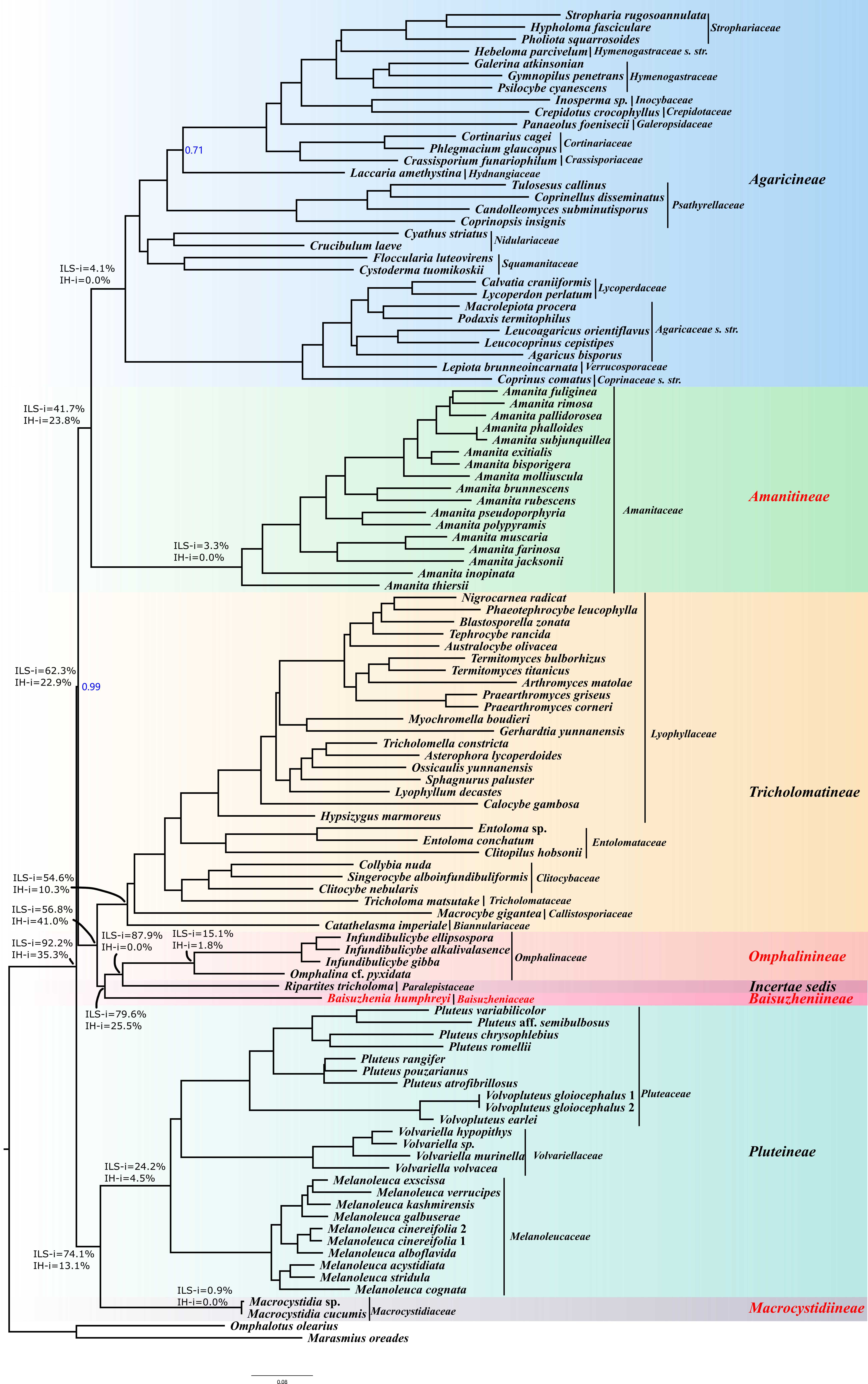 在此基础上,研究人员以蘑菇目Agaricales中系统发育冲突较为显著的蘑菇亚目Agaricineae-光柄菇亚目Pluteineae-口蘑亚目Tricholomatineae(简称“APT”)为研究对象,囊括了142个基因组(其中自测64个)数据,深度解析了其系统发育关系。Phytop分析表明APT各亚目内存在广泛且强烈的不完全谱系分选和渐渗/杂交信号,其下各支系间的关系可能呈网状进化模式,二歧分支的系统发育树难以反映其真实的演化历史。整合系统发育分析结果、EQP-IC值和形态学特征,该研究在原有ATP三亚目的基础上,新增了3个新亚目:鹅膏亚目Amanitineae、大囊伞亚目Macrocystidiineae和亚脐菇亚目Omphalinineae。此外,研究发现过去隶属于拟韧革菌目Stereopsidales的物种绒盖拟韧革菌Stereopsis humphreyi与APT亲缘关系较近,形成一个独立的支系,该研究为其建立了新亚目素贞菌亚目Baisuzheniineae、新科素贞菌科Baisuzheniaceae、新属素贞菌属Baisuzhenia和新组合素贞菌Baishuzhenia humphreyi。