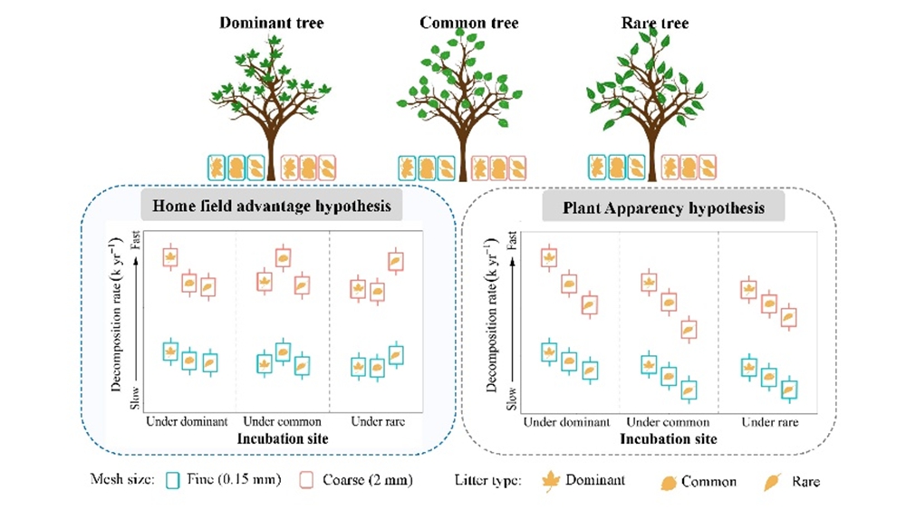 凋落物分解是森林生态系统物质循环的关键过程,对碳固持和养分循环具有重要意义。通常认为,在群落尺度上,凋落物分解速率受凋落物种类质量和生境土壤微生物影响表现出明显的主场效应,即凋落物在其栖息地(主场)的分解速率通常快于其他生境(客场)(主场效应假说)。需要指出的是,群落中优势树种(尤其是成年树木)可产生数量多且空间分布更广的凋落物,其在群落中更易被分解者发现而可能受到的取食机率较高,并表现出植物显现度效应,即优势树种提供的持续资源供应可能驱动分解者的适应性,从而加速分解速率(显现度假说)。在多样性丰富且生境异质性高的热带森林中,不同树种凋落物分解的是否呈现主场效应,还是植物显现度效应尚不得而知。