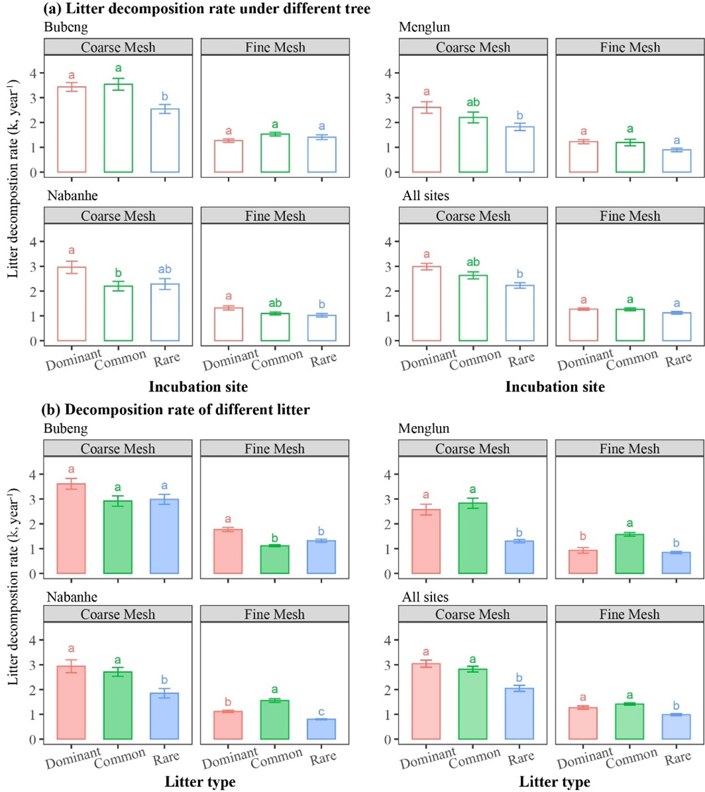 为了验证上述两个假说,中国科学院西双版纳热带植物园(以下简称“版纳植物园”)研究团队在我国西南的三个热带雨林中进行了凋落叶交互移植的原位分解控制实验。在每个森林样地中选择三种林冠树种,并根据其在样地中的基面积将其划分为研究林地中的优势,常见和稀有树种,同时使用两种网孔(0.15mm和2mm)的分解袋来控制土壤动物(分解者)对凋落物分解的影响。研究结果表明:在2mm网孔分解袋中(土壤动物参与分解),凋落物分解速率呈现出优势树种下快于稀有树种下,且与凋落物种类无关。此外,优势树种的凋落物分解速度也快于稀有树种的凋落物。在0.15mm网孔分解袋中(排除土壤动物参与分解),凋落物分解速率则受控于凋落物种类(质量),与分解的场地位置无关。该研究结果支持了植物显现度假说,表明在多样性丰富的热带雨林中,土壤动物对凋落物分解的影响具有明显的植物显现度效应,土壤动物对优势树种凋落物适应性可显著的影响分解,且与凋落物质量或土壤养分状况无关。