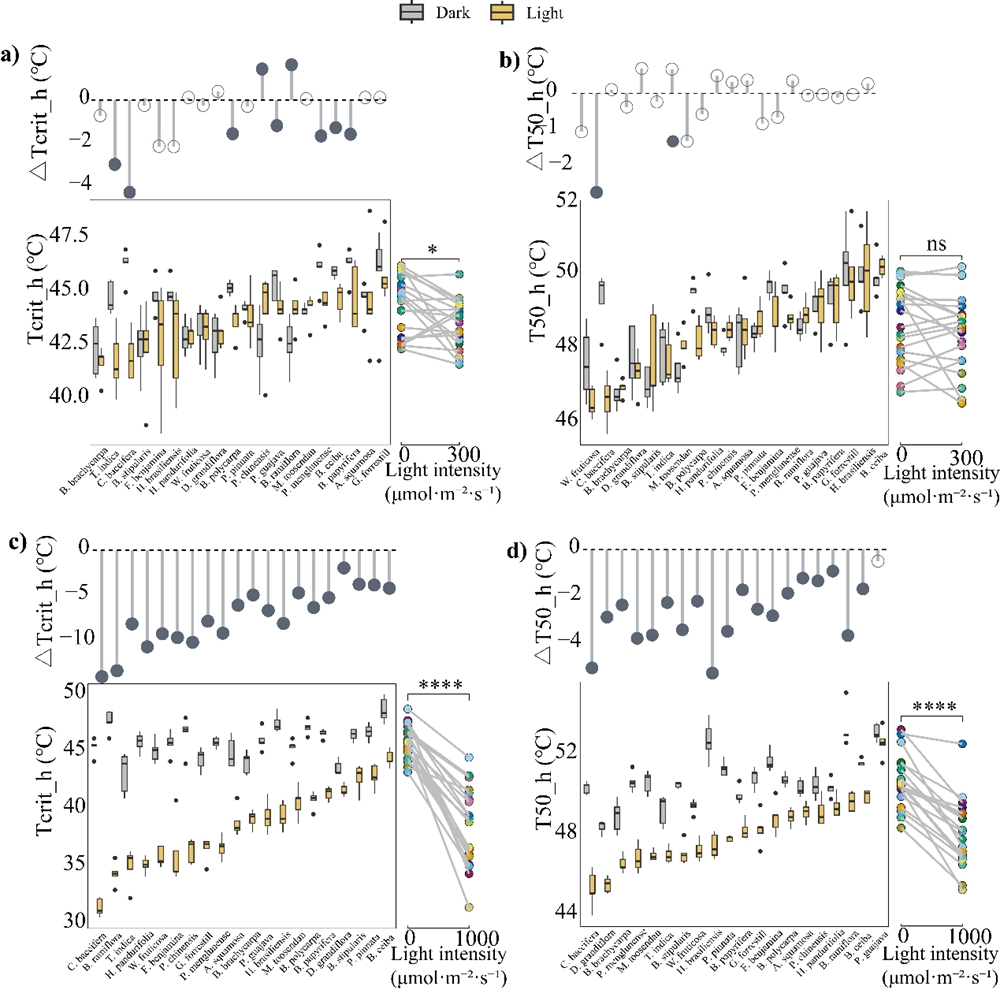 为了深入探究光照对植物热力耐受性的影响,该研究选择了中国科学院西双版纳热带植物园(以下简称“版纳植物园”)的20种自然生长的冠层树种为研究对象。在热处理时,设置不同光照强度,测量其光合系统Ⅱ的耐热性;在弱光条件下,进行冷处理,测量其光合系统Ⅱ的耐冷性。研究发现弱光(300μmol·m²·s⁻¹)对耐热性的影响呈现出物种特异性,而强光(1000μmol·m²·s⁻¹)则降低了所有测试树种的耐热性(番石榴Psidium guajava 的T50_h的变化不显著,其余物种均达到显著水平)。其中Tcrit_h的变化范围为-13.96 ℃ ~ -1.96 ℃;T50_h的变化范围为-5.26 ~ -0.92℃。弱光(200 μmol·m²·s⁻¹)显著降低了所有 10 种测试树种的耐冷性,Tcrit_c的变化范围为2.76 ℃ ~ 10.52 ℃, T50_c的变化范围为2.02 ℃ ~ 7℃。其中,气体交换速率较高的树种(Amax和Emax)在热胁迫下对光诱导损伤的抵抗力更强。叶片厚度能缓解强光导致的耐热性降低,并在低温胁迫下提供物理性光保护。