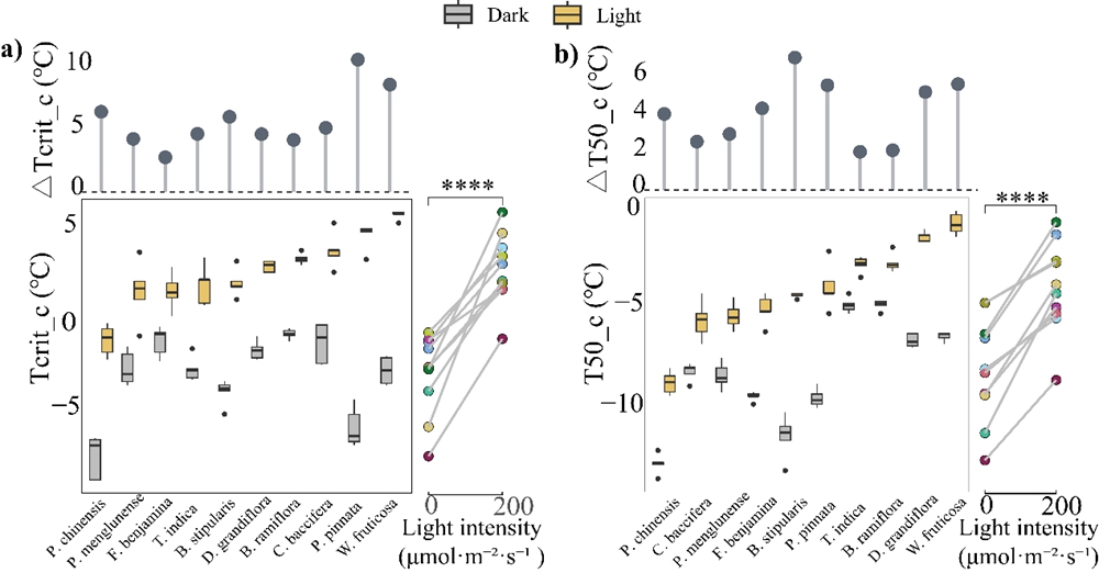 图2 冷处理过程中光照对耐冷性(a. Tcrit_c,b. T50_c)的影响。