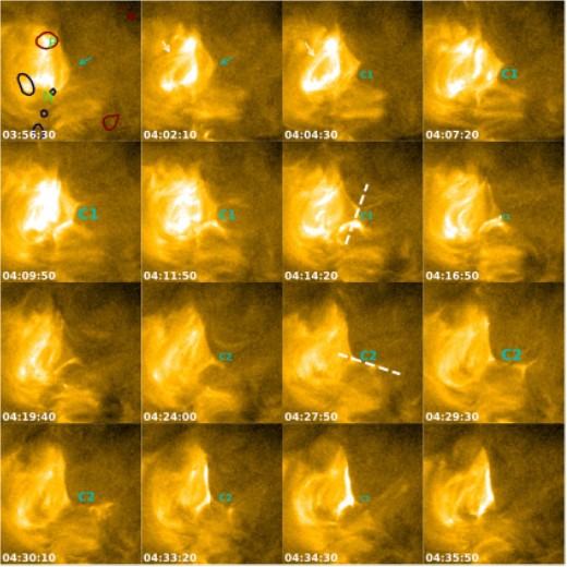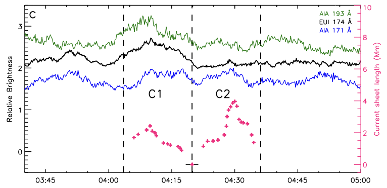 图1: Solar Obiter 174 Å图像中捕捉到的日冕亮点及振荡重联过程。磁重联沿电流片C1向C2反转。