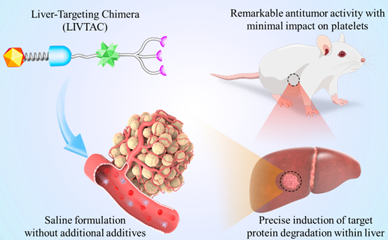 前期,中国科学院昆明动物研究所何永捍团队联合上海药物研究所张翾团队,利用肝脏特异高表达的去唾液酸糖蛋白受体(Asialoglycoprotein receptor, ASGPR),将PROTAC分子与ASGPR配体偶联,成功开发出肝脏靶向的蛋白降解剂(Liver-targeting chimera,LIVTAC)(图1)。LIVTAC主要在肝脏被摄取和释放,可精准降解肝内靶蛋白,特异杀伤肝癌细胞,从而有效地抑制肝癌的进展,显著提高生存率(Chen et al. Journal of Controlled Release. 2024)。