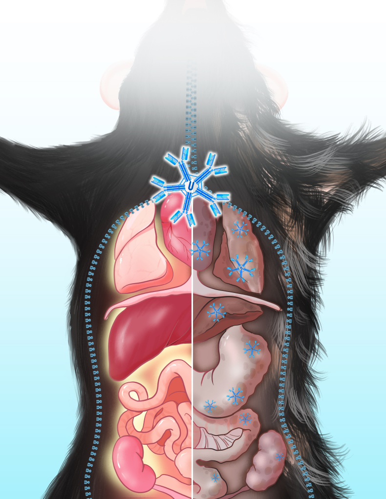 图1. IgM在小鼠多组织中随衰老累积的示意图。(图片展示了小鼠从年轻(左)到年老(右)的演变,蓝色的IgM分子在年老小鼠的多个器官中显著富集,寓意其可作为追踪组织/器官衰老和评估抗衰老干预效果的通用生物标志物)