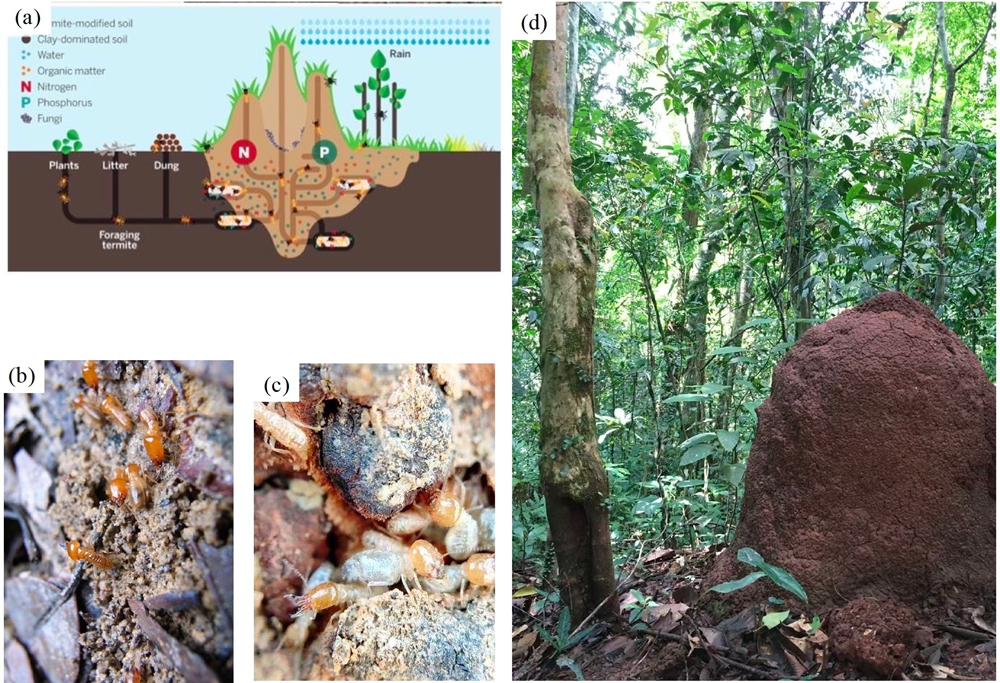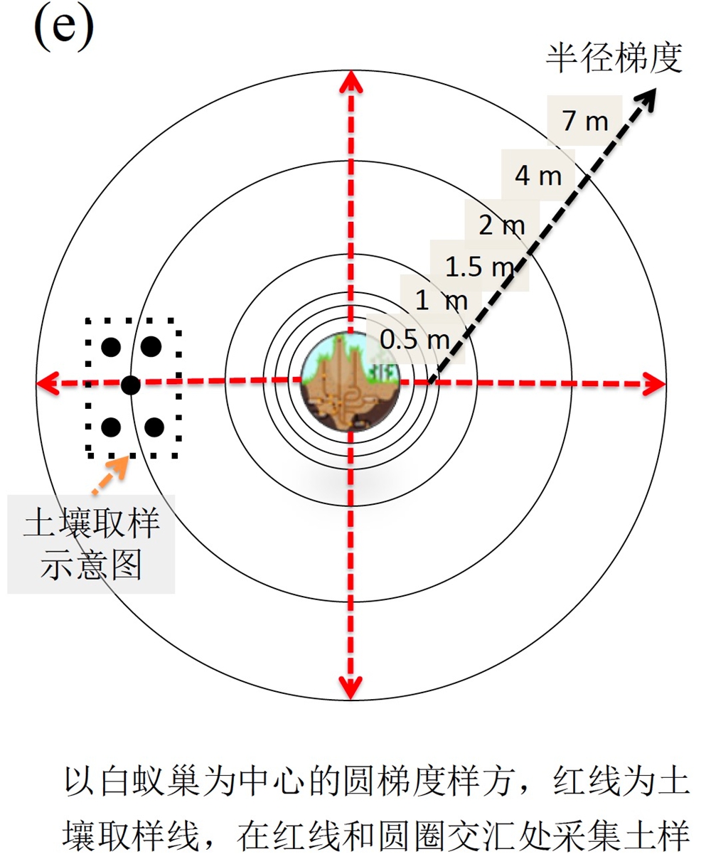 图1.白蚁通过筑巢和觅食等生命活动显著提高了蚁巢附近的土壤养分异质性(a,摘自Elizabeth 2015);大白蚁属(Macrotermes)白蚁(b)和土白蚁(Odontotermes)属白蚁(c);西双版纳勐仑保护区常见的白蚁巢(d);研究采样示意图(e)。