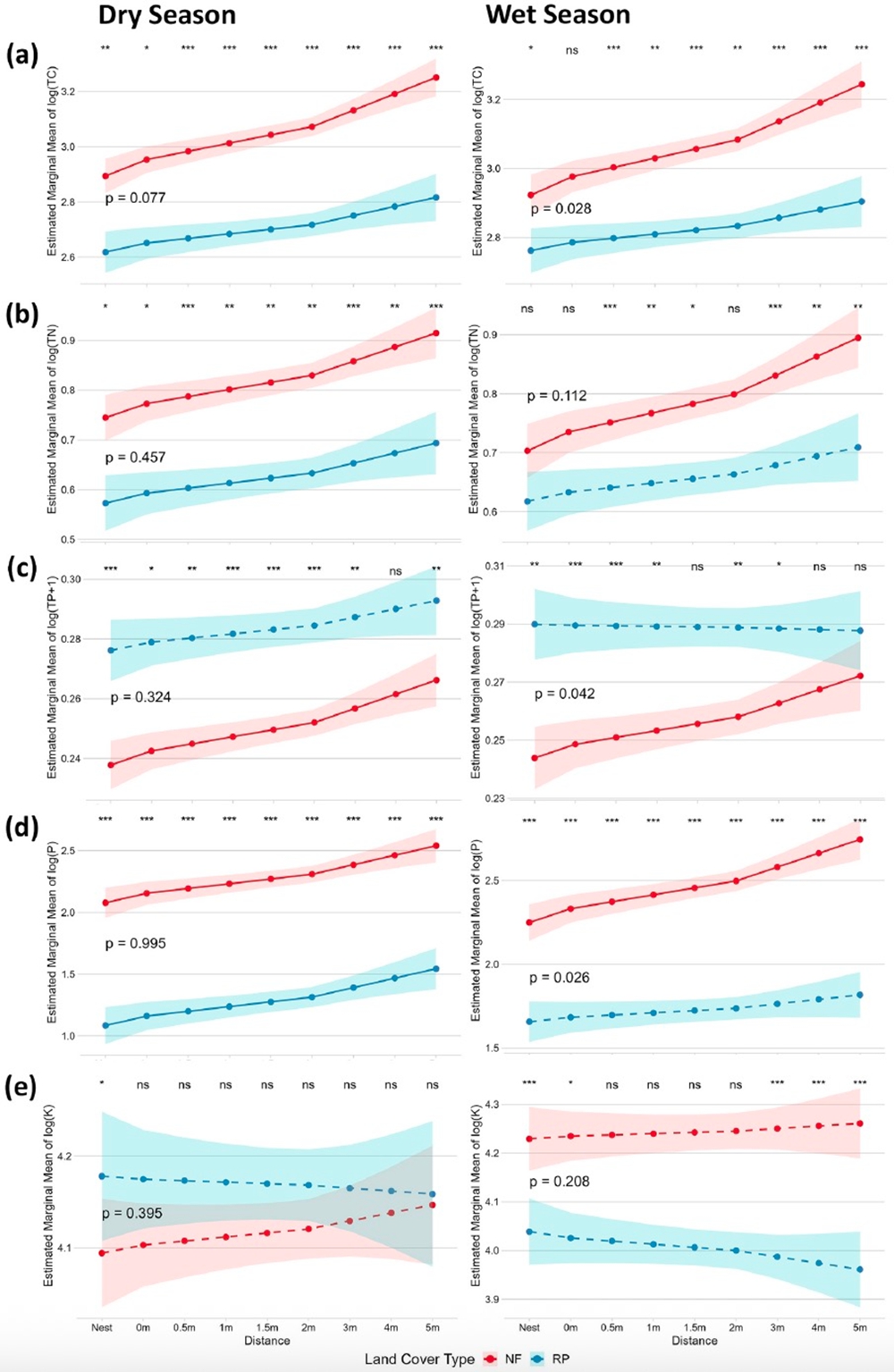 图2.土壤总碳(TC)、总氮(TN)、总磷(TP)、可交换磷(P)和可交换钾(K)随白蚁巢距离变化的估计边际均值。线条表示估计边际均值,阴影部分为95%置信区间。