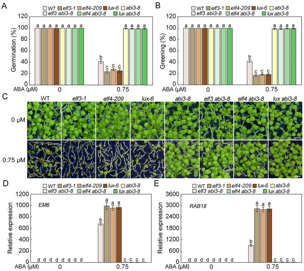 图1. ELF3、ELF4或LUX位于ABI3上游调控ABA信号介导的种子萌发(Tang et al., 2025,Plant Cell)。