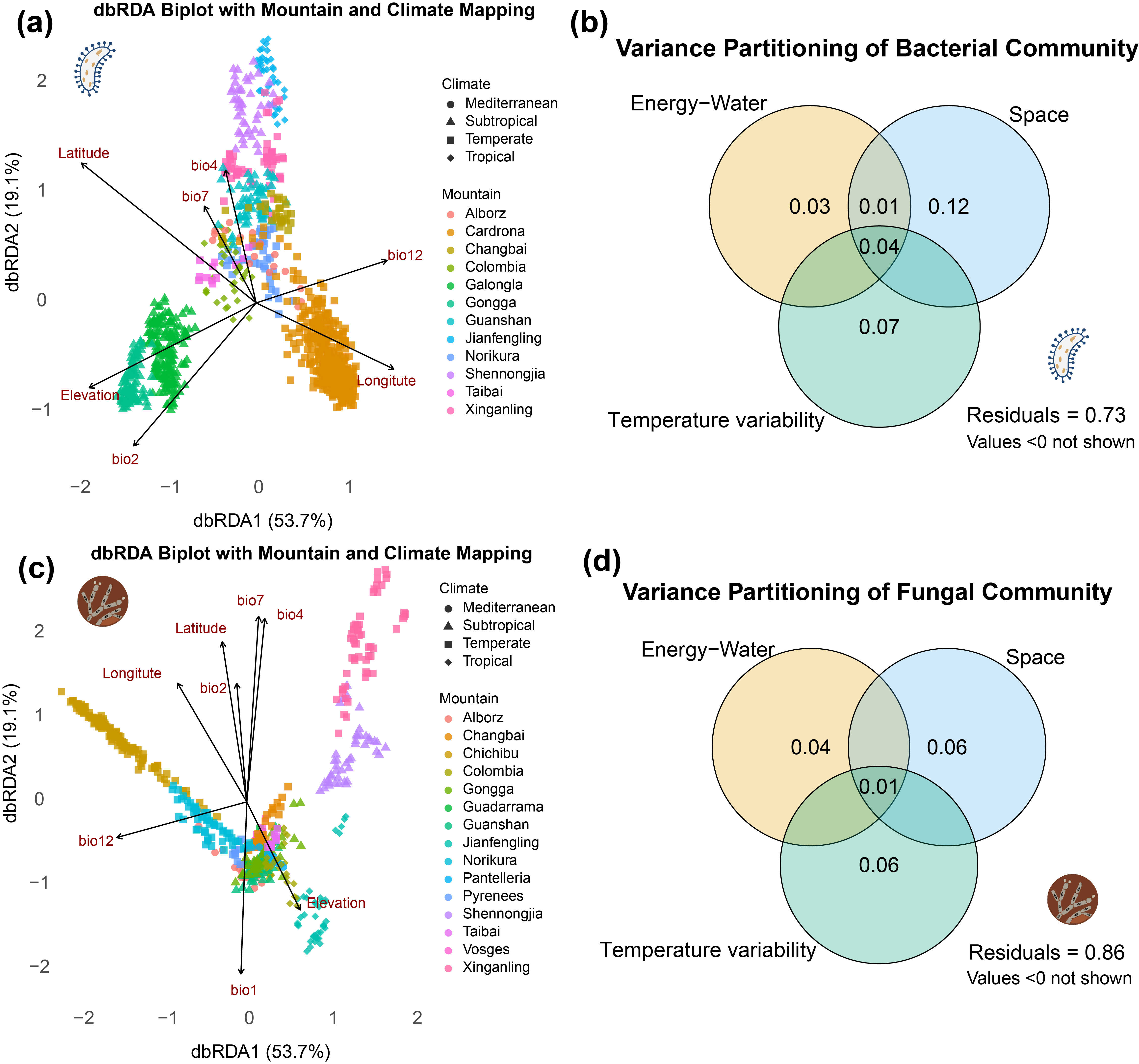 自该假说诞生半个多世纪以来,动植物相关的研究大多支持其合理性,但是微生物相关的研究较少。研究人员前期在区域尺度验证了该假说在微生物中的适用性(Zhang et al.,2024 Ecography DOI: 10.1111/ecog.07049),但是目前仍旧缺乏全球微生物组证据。该研究收集了2008-2023年间山地微生物群落数据,涵盖全球17个山地268个海拔带。研究发现,细菌群落主要受纬度、温度可变性和海拔的影响,而真菌群落仅受温度和纬度的轻微影响。热带地区细菌与真菌群落的Bray-Curtis距离衰减率显著高于温带地区。随着纬度和温度变化增加,细菌的特有性显著降低,而真菌的这一趋势较弱。细菌群落构建主要由环境选择和扩散限制驱动,而真菌则主要受扩散限制和随机漂变影响,且扩散限制对细菌的作用随纬度升高而减弱。研究人员证实细菌群落比真菌群落更符合简森假说,表现为低纬度地区更陡的距离衰减、更高的特有性和更强的扩散限制。这也提醒我们将经典生态理论应用于微生物研究时,需综合考虑不同区域和类群的特异性。该研究为理解海拔与气候梯度下微生物多样性维持机制提供了依据。