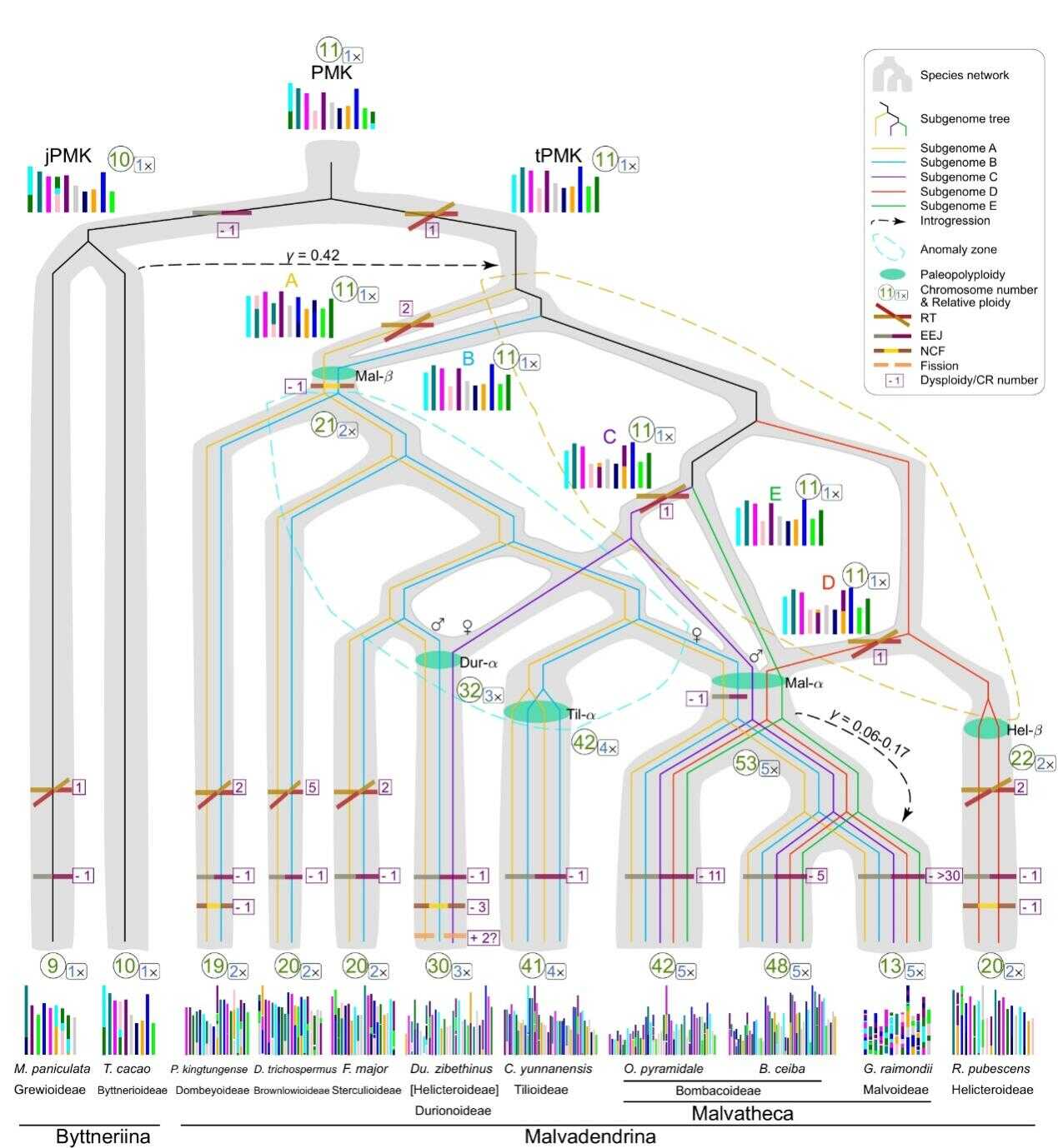 研究结果表明,锦葵科早期复杂的网状异源多倍化过程快速产生了至少5个倍性不同的古老多倍体谱系,Malvadendrina分支的7个亚科都经历1至2次古多倍化事件,因此多倍体成种在Malvadendrina分支的早期分化中至关重要。通过重建祖先核型追踪锦葵科祖先多倍化和随后二倍化的演化过程,研究团队发现各亚科的染色体二倍化主要由染色体的端到端融合(End-to-End Joining, EEJ)机制介导。在古十倍体雷德蒙氏棉花基因组的进化过程中,发生了超过30次谱系特异的EEJ事件,染色体数量从祖先的n = 53直降到n = 13。