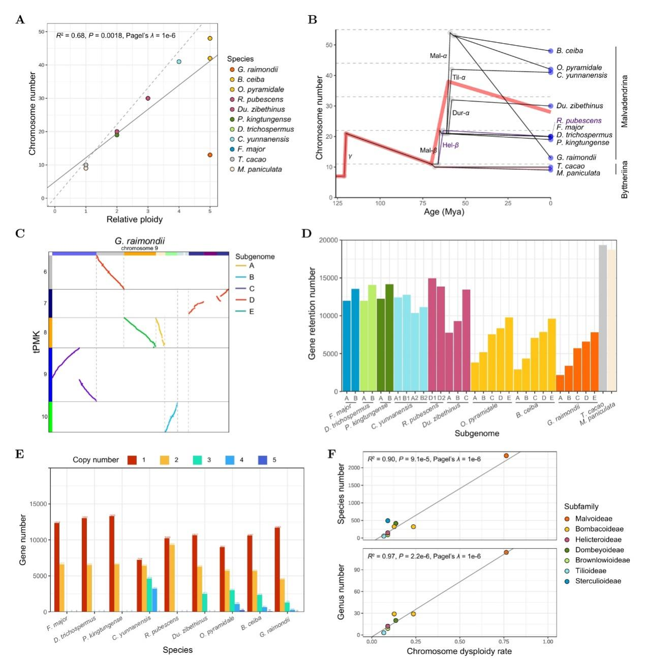 Malvadendrina分支所有亚科均为6000万年前左右形成的古多倍体,但各亚科的物种多样性存在明显差异,且与古多倍性并不相关,其中大多数亚科的种属数量甚至低于同期未发生过古多倍化的两个基部亚科。而以棉花为代表的锦葵亚科表现出最高的二倍化程度:与其他古多倍体亚科相比,其融合的染色体数量和丢失的共线性基因数目断崖式领先,且明显高于与其共享古十倍化的木棉亚科;而锦葵亚科也是所有亚科中种属数量最多的,因此推测二倍化可能对物种多样性的形成至关重要。