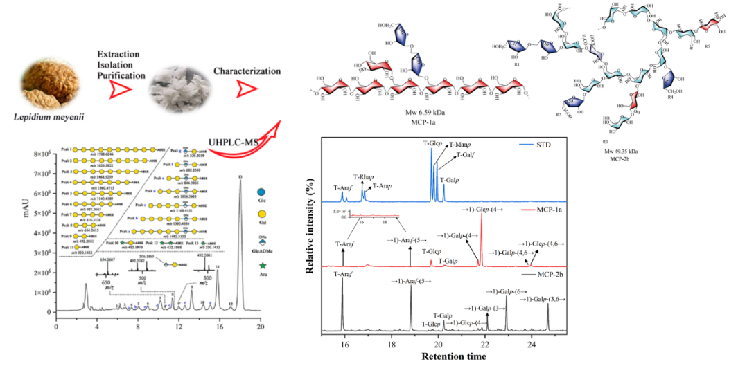 邱明华团队从黄色玛咖块茎中分离得到8个均一多糖,并系统解析了MCP-1a和MCP-2b两种多糖的精细结构。MCP-1a为分子量6.6 kDa的杂多糖,主要由D-葡萄糖组成(90.23%),其主链由1,4,6-α-D-葡萄糖单元构成,侧链含有末端α-L-阿拉伯糖、1,5-α-L-阿拉伯糖和末端α-D-葡萄糖残基。MCP-2b是一种分子量达49.4 kDa的阿拉伯半乳聚糖,属于少见的II型阿拉伯半乳聚糖,其主链由1,6-β-D-半乳糖和1,3,6-β-D-半乳糖构成,并含有少量1,3-β-D-葡萄糖醛酸-4-OMe单元。团队还确定了其他六个新的均一性多糖,包括一种高分子量α-葡聚糖(MCP-3,分子量1950.99 kDa)和五种不同分子量的同型半乳糖醛酸聚糖(MCP-4a、MCP-4b、MCP-4c、MCP-5a、MCP-5b)。有趣的是,首次在玛咖中发现了含有α-D-Δ4,5-半乳糖醛酸残基的果胶多糖MCP-4c。这种不饱和结构此前主要在海洋生物中发现,其在陆生植物中的存在丰富了对植物多糖结构多样性的认识。