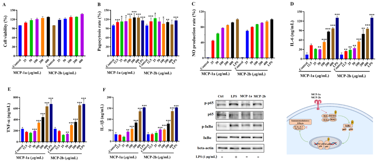 在阐明结构基础上,对其多糖免疫活性的分子机制探索,获得了一系列重要发现:1)细胞水平的免疫活性:体外细胞实验显示,MCP-1a和MCP-2b在50-400 μg/mL浓度范围内表现出良好的细胞相容性,同时能够有效激活RAW 264.7巨噬细胞。多糖处理显著增强了细胞的吞噬活性,并促进细胞释放一氧化氮(NO)等免疫调节分子。在400 μg/mL浓度下,MCP-1a和MCP-2b诱导的NO产生率分别达到91.98%和94.26%。2)炎症因子调节作用:研究发现两种多糖能够剂量依赖性地促进巨噬细胞产生多种重要的炎症介质,包括白细胞介素-1β(IL-1β)、肿瘤坏死因子-α(TNF-α)和白细胞介素-6(IL-6)等。这些结果表明玛咖多糖具有调节先天免疫功能的潜力。3)信号通路机制探索:WB分析揭示了多糖发挥免疫调节作用的关键分子机制:MCP-1a和MCP-2b能够激活NF-κB信号通路,显著上调该通路中关键转录因子的表达,包括IκB-α、磷酸化IκB-α、p65和磷酸化p65蛋白。这一发现为揭示玛咖多糖的免疫调节机制提供了重要的分子基础。