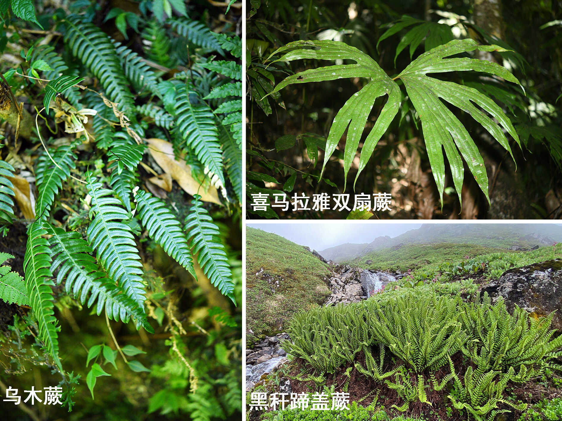 团队共采集标本1015号(云南段312号,西藏段703号)、3000余份;拍摄生态照片12500余张。考察记录了一批喜马拉雅地区的特色物种,包括:高黎贡山分布的乌木蕨(Blechnidium melanopus);墨脱阔叶林中局部密集生长的喜马拉雅双扇蕨(Dipteris wallichii);墨脱高海拔区域成片生长的黑秆蹄盖蕨(Athyrium wallichianum)等,见图1。