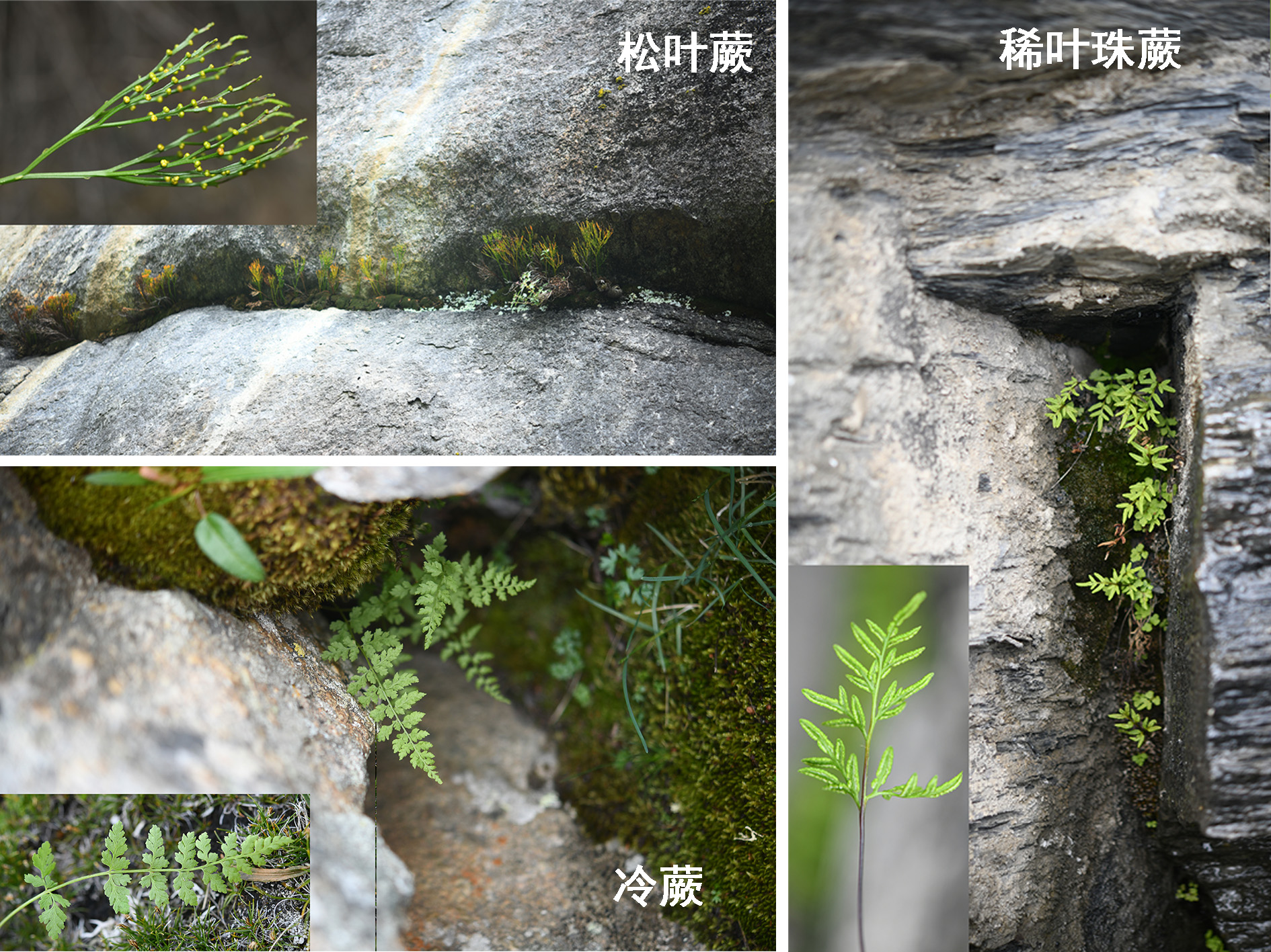 此外,团队更新了多个物种的垂直分布纪录,包括:3010米悬崖附生的松叶蕨(Psilotum nudum)、5090米岩缝中的稀叶珠蕨(Cryptogramma stelleri)、及5098米石隙分布的冷蕨(Cystopteris fragilis)等,见图3。