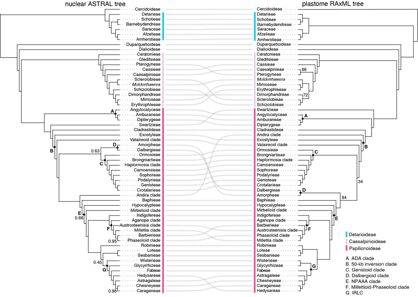 图2 豆科核基因和质体基因组系统发育树在族级分支层面存在的核质冲突
