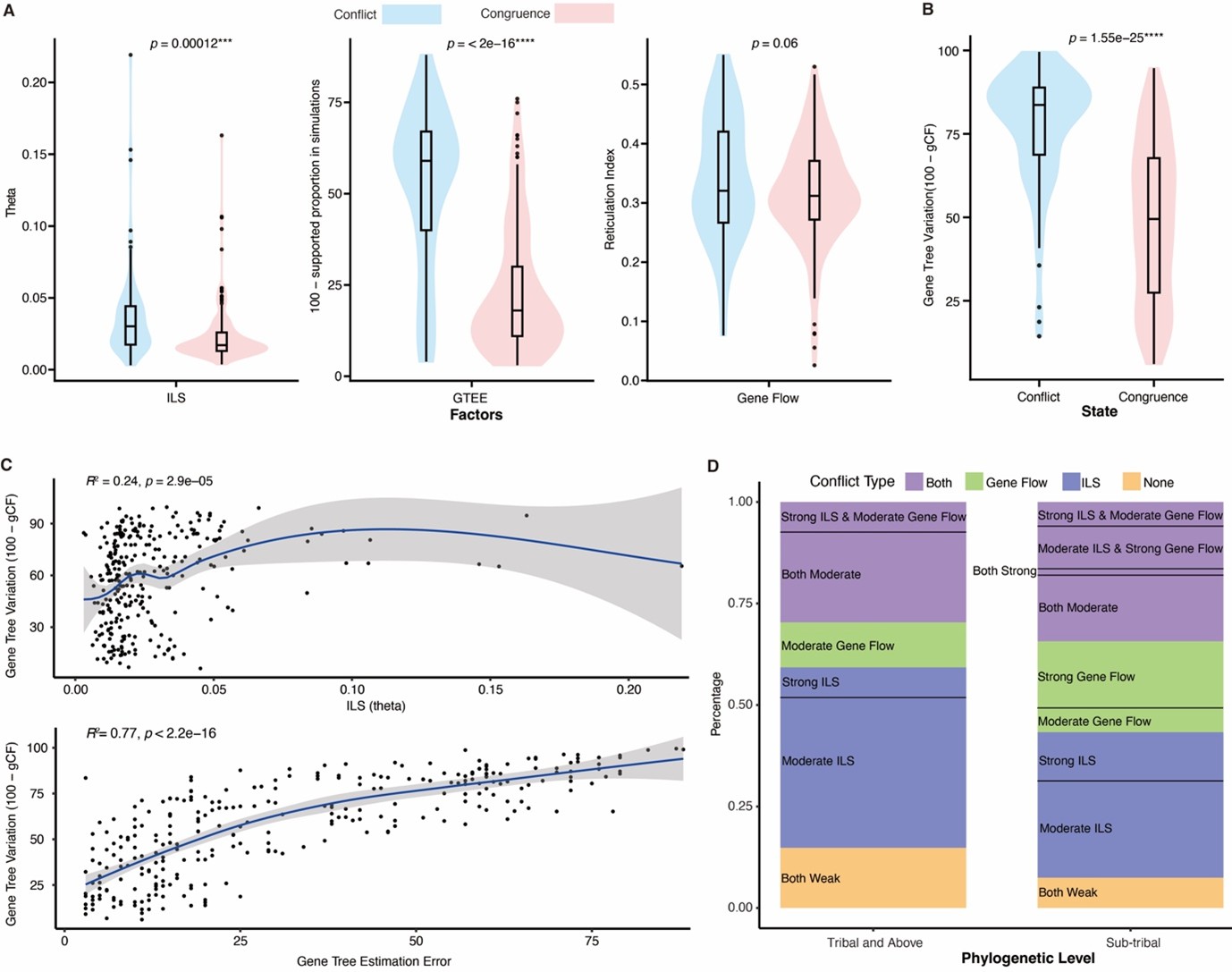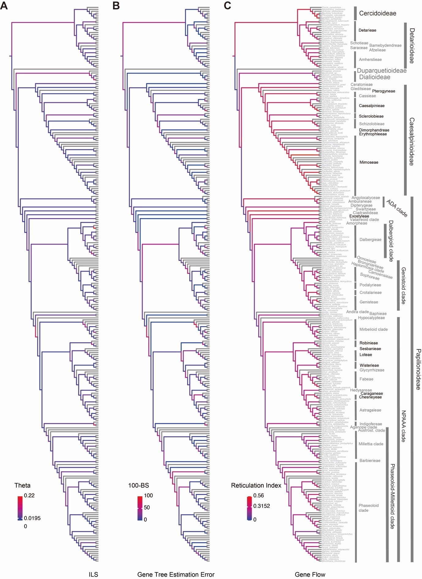 图3 不完全谱系选、基因树估计误差以及基因流对豆科植物系统发育树结构的影响