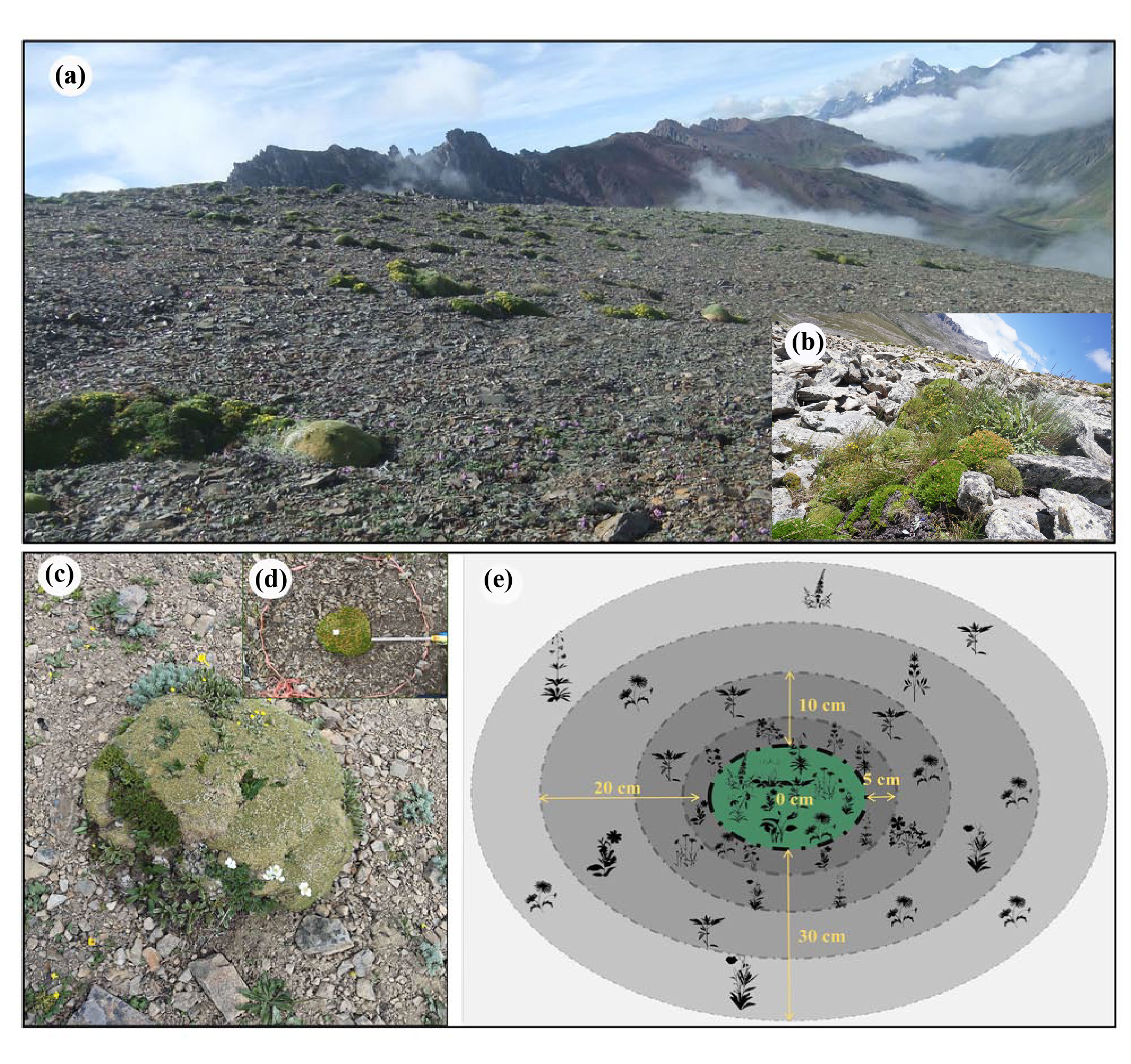 图1 (a) 研究地概况;(b) 横断山代表性垫状植物微群落;(c)代表性垫状植物团状福禄草;(d) 野外实验操作示意图;(e) 微群落调查方案示意图。