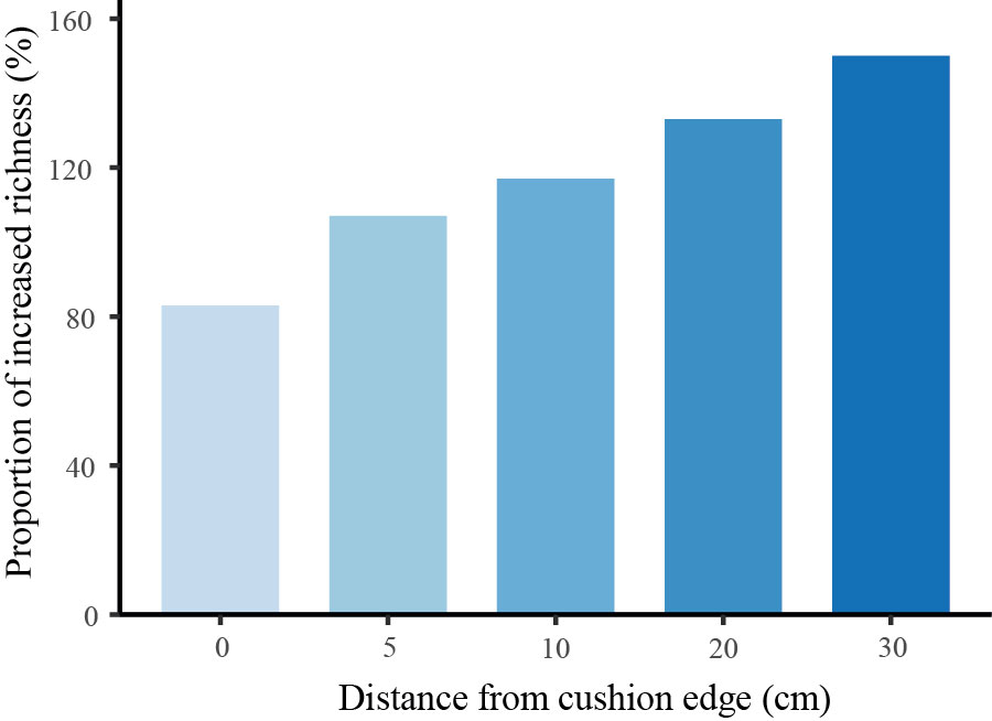 图2 由垫状植物在不同距离梯度上构建的微群落对大尺度群落整体物种丰富度的提升比例