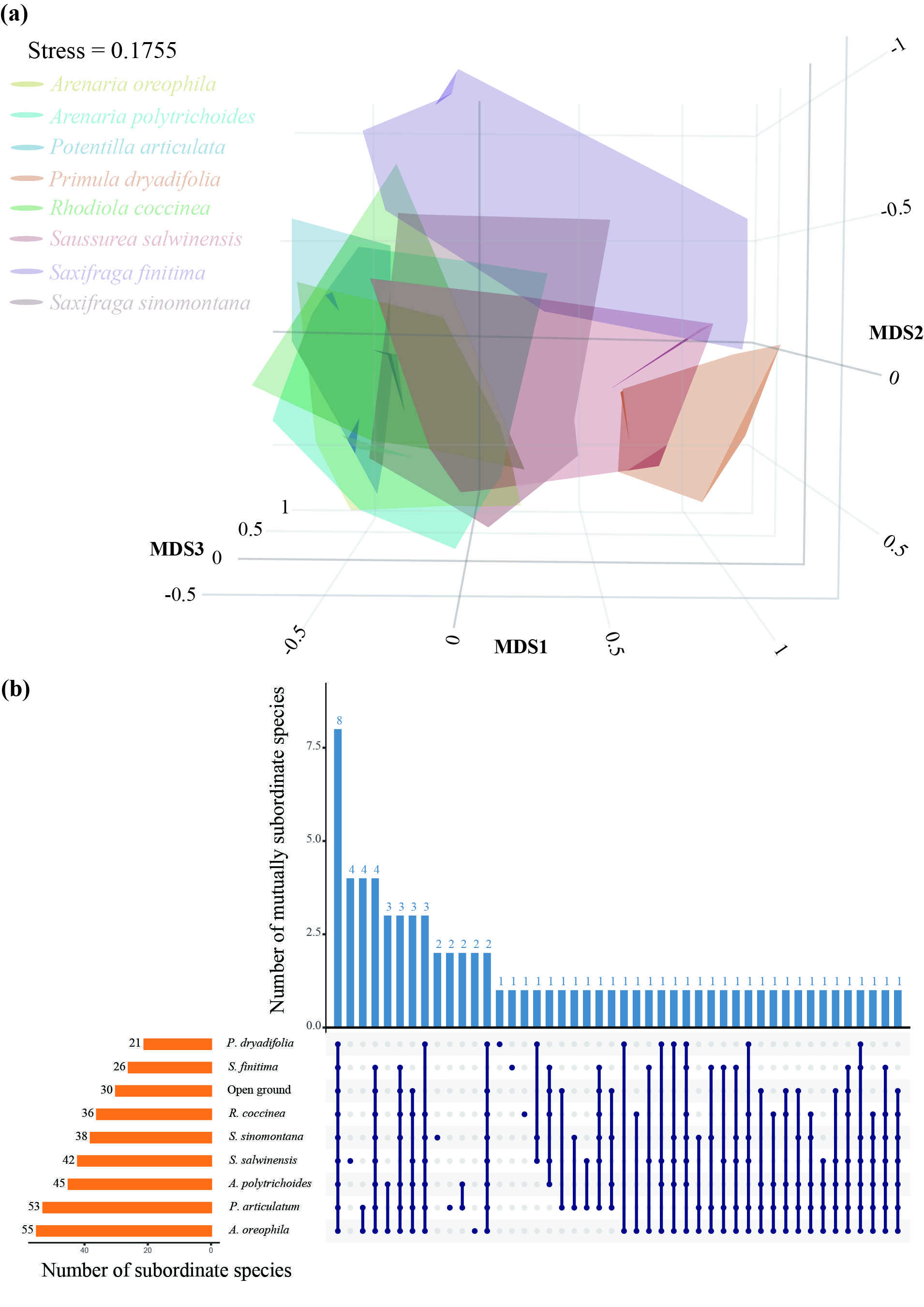 图3 (a) 不同垫状植物所构建的微群落内物种组成的分化情况;(b) 不同垫状植物所构建的微群落内物种丰富度及共有物种情况。