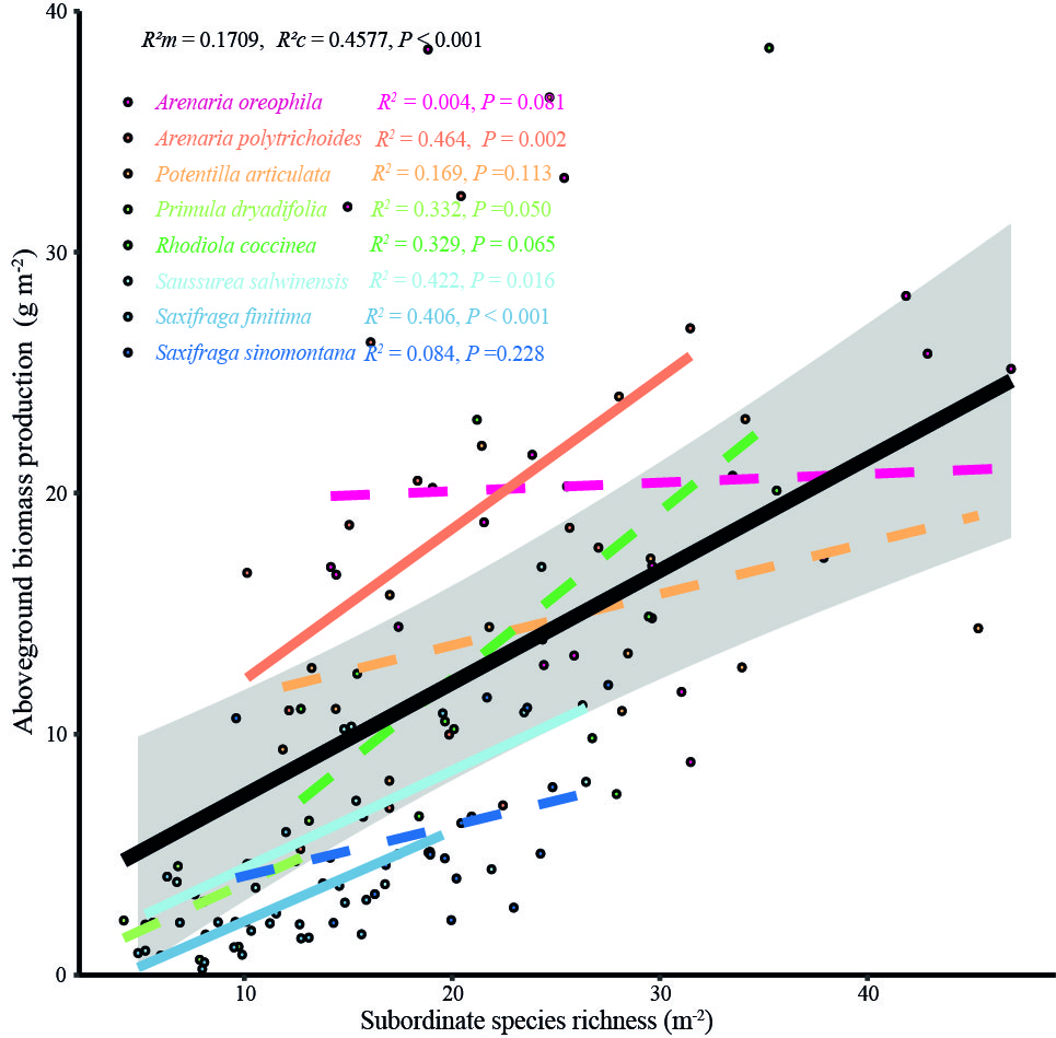 图4 物种丰富度与地面生物量产出的相关关系。粗黑色拟合线代表大尺度群落水平上物种丰富度与群落整体生物量产出的相关关系;其余代表由不同垫状植物构建的微群落内物种丰富度与相应微群落内地面生物量产出的相关关系。