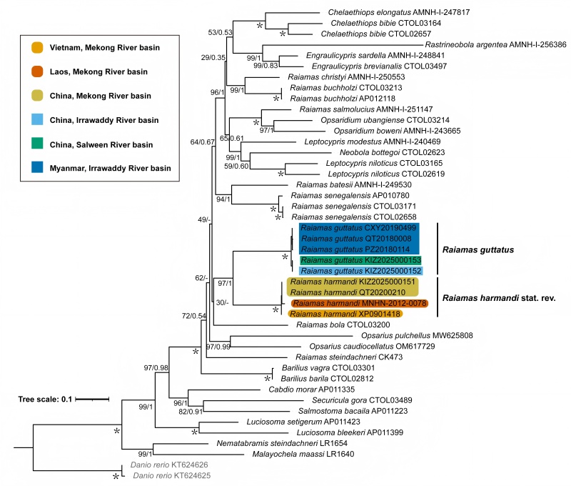 近日,中国科学院昆明动物研究所东南亚野生动物多样性课题组联合法国自然历史博物馆、中科院水生生物研究所等机构,对澜沧江、怒江和伊洛瓦底江的标本进行了详细比对,并结合线粒体基因COI和Cyt b的串联序列进行系统发育分析。结果表明,湄公河流域的哈氏长嘴鱲形成一个独立的支系,与伊洛瓦底江和萨尔温江的长嘴鱲互为姐妹群,两者与孟加拉长嘴鱲(Raiamas bola)再组成姐妹群。这一分子证据与形态特征相吻合,强有力地支持了哈氏长嘴鱲的物种有效性。