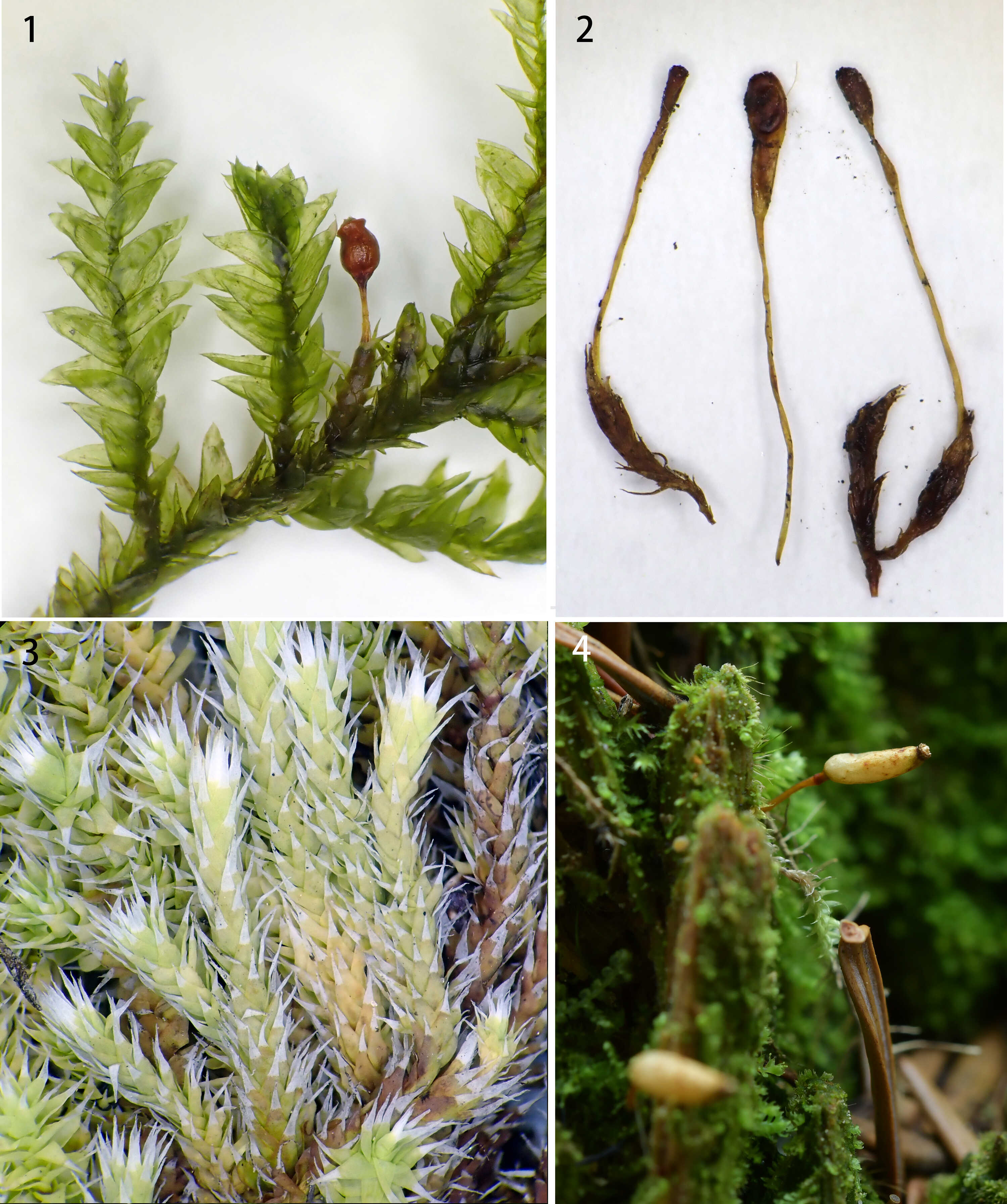 明星苔藓植物代表(1:亮蒴藓Shevockia inunctocarpa;2:北方长蒴藓Trematodon brevicollis;3:中华虎尾藓Hedwigia sinica;4:花斑烟杆藓Buxbaumia punctata)