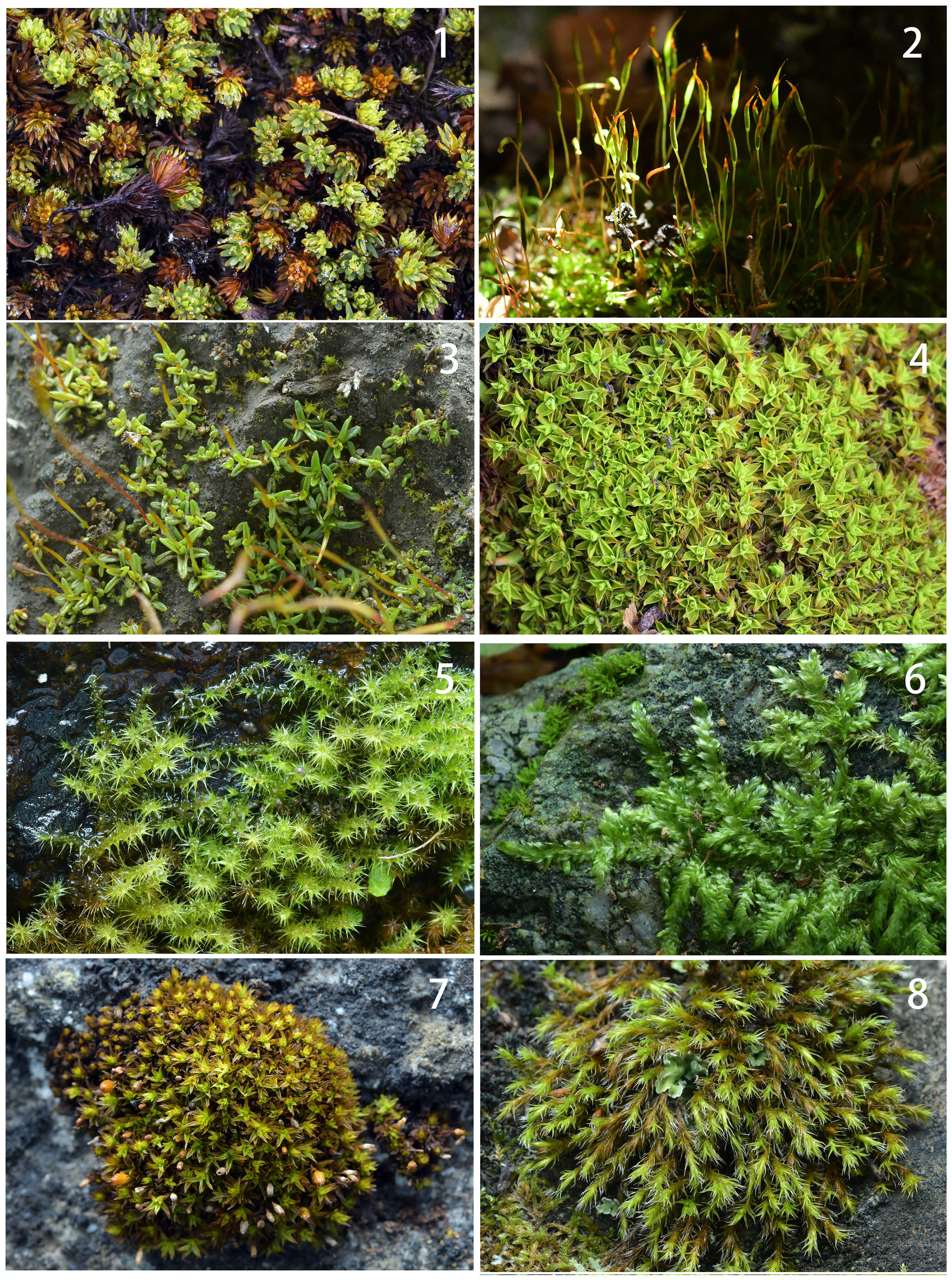 形态各异的苔藓植物(1:全缘小金发卷叶亚种Pogonatum perichaetiale subsp. thomsonii;2:高山赤藓Syntrichia sinense;3:钝叶芦荟藓Aloina rigida;4:长尖叶赤藓Syntrichia submontana;5:小蔓藓Meteoriella soluta;6:绢藓Entodon sp.;7:木灵藓 Orthotrichum sp.;8:连轴藓Schistidium sp.)