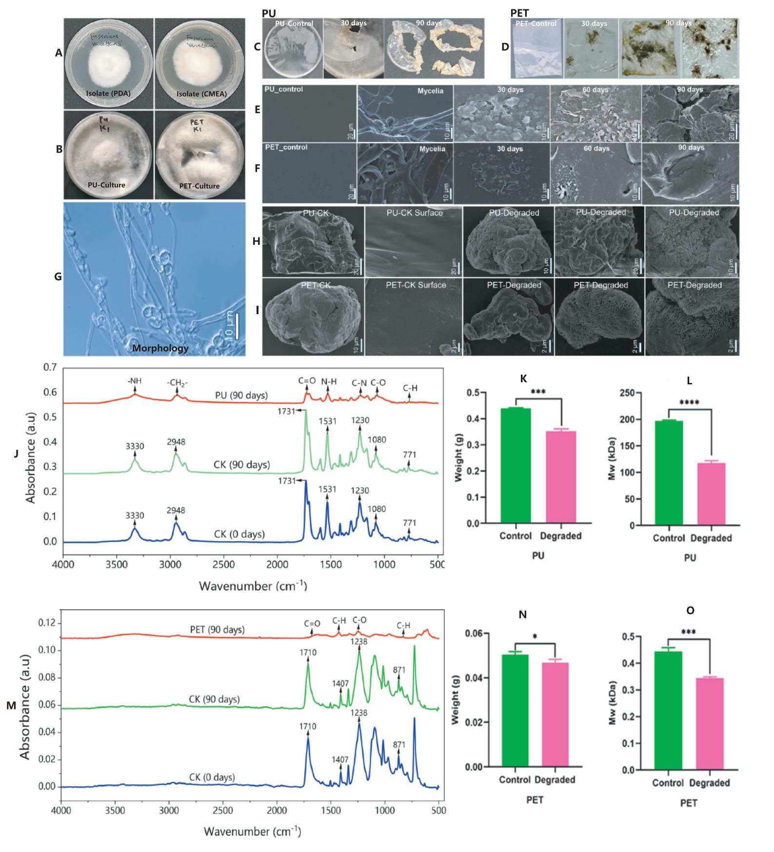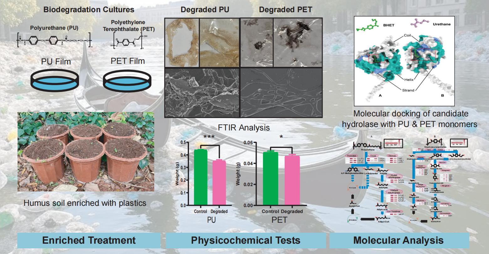 聚氨酯(PU)和聚对苯二甲酸乙二醇酯(PET)是日常生活中广泛使用的塑料聚合物(如家具、涂料、瓶子和纺织品),占城市固体垃圾的很大比例。它们因其惰性难以自然降解,对生态系统、生物多样性和人类健康构成严重威胁。环境中的多样化的微型真菌被认为是解决塑料污染的一种有前景的绿色方案。它们能分泌多种酶(如酯酶、角质酶、漆酶等),进而分解塑料聚合物。然而,大多数研究仅限于单一塑料,且对其背后的具体分子机制了解甚少。而在现实环境中,塑料污染物多以混合物形式存在,但关于单一菌株能否同时高效降解多种塑料,以及驱动这一过程的关键基因、酶和代谢途径,仍然缺乏系统性的、多组学层面的深入研究。