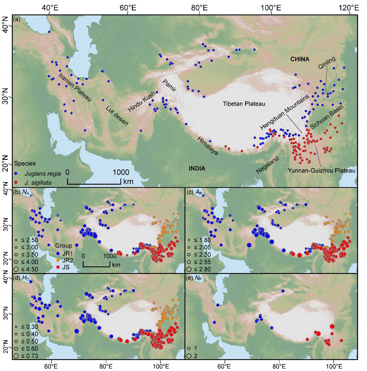 图1 亚洲胡桃和泡核桃群体的取样地点(a)和不同遗传多样性参数的地理分布格局(b-e)。蓝色、橙色和红色的点分别代表胡桃(JR1、JR2)和泡核桃(JS)遗传分组;点的大小表征多样性高低。