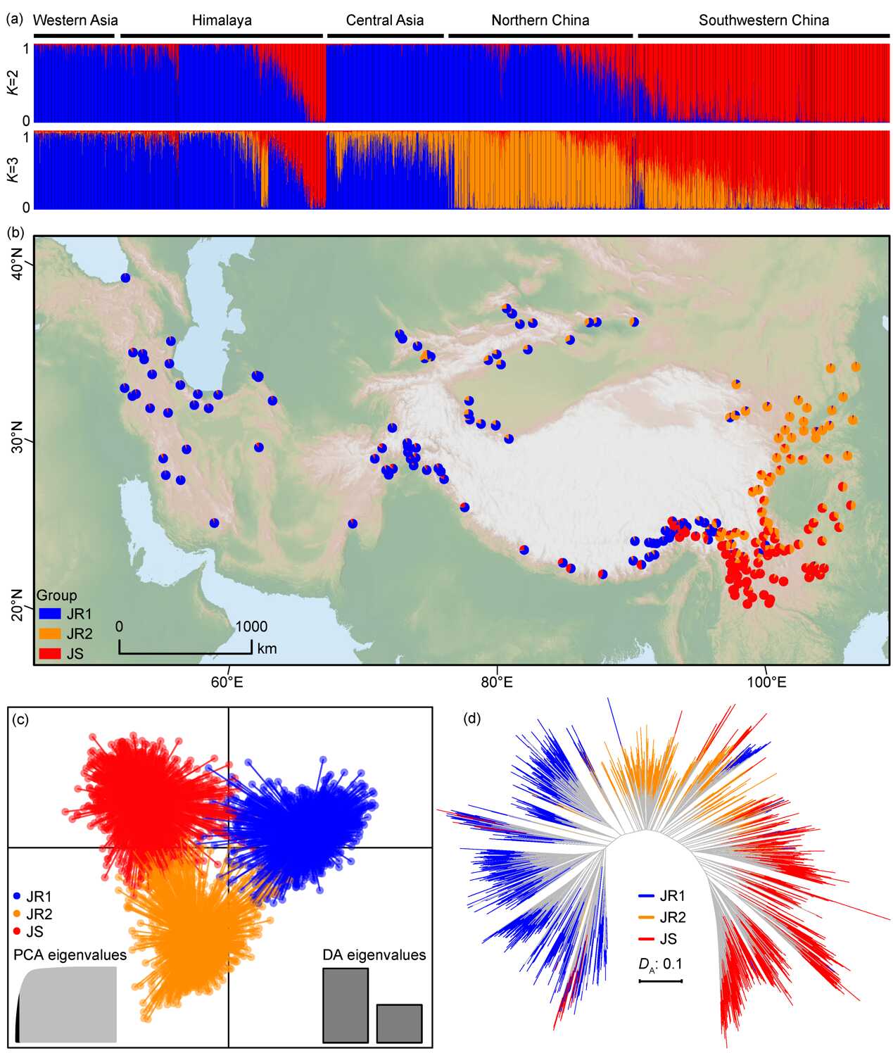 图2 亚洲胡桃和泡核桃群体遗传结构。(a)贝叶斯聚类分析(STRUCTURE),(b)基于STRUCTURE结果(K=3)的空间遗传格局,(c)不同分组间的主成分判别分析(DAPC),(d)基于Nei遗传距离(DA)的无根邻接树。